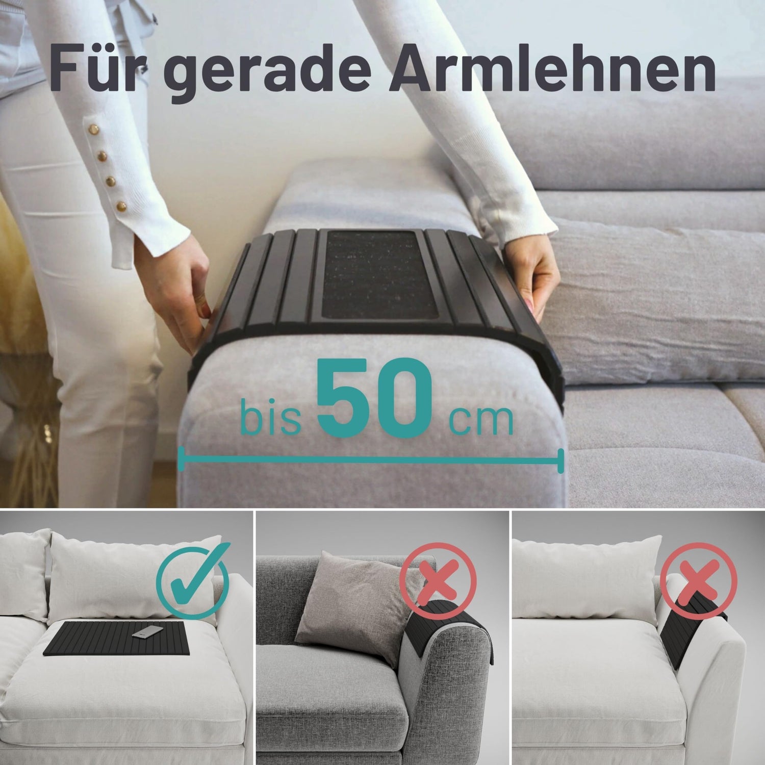 • FLEXIBEL EINSETZBAR: Ideal als Armlehnen Ablage für Gläser und Snacks, oder Getränkehalter auf geraden Sofalehnen von 10 - 47 cm Breite. Das Sofa Tablett ist auch als Beistelltisch auf der Sitzfläche einsetzbar.