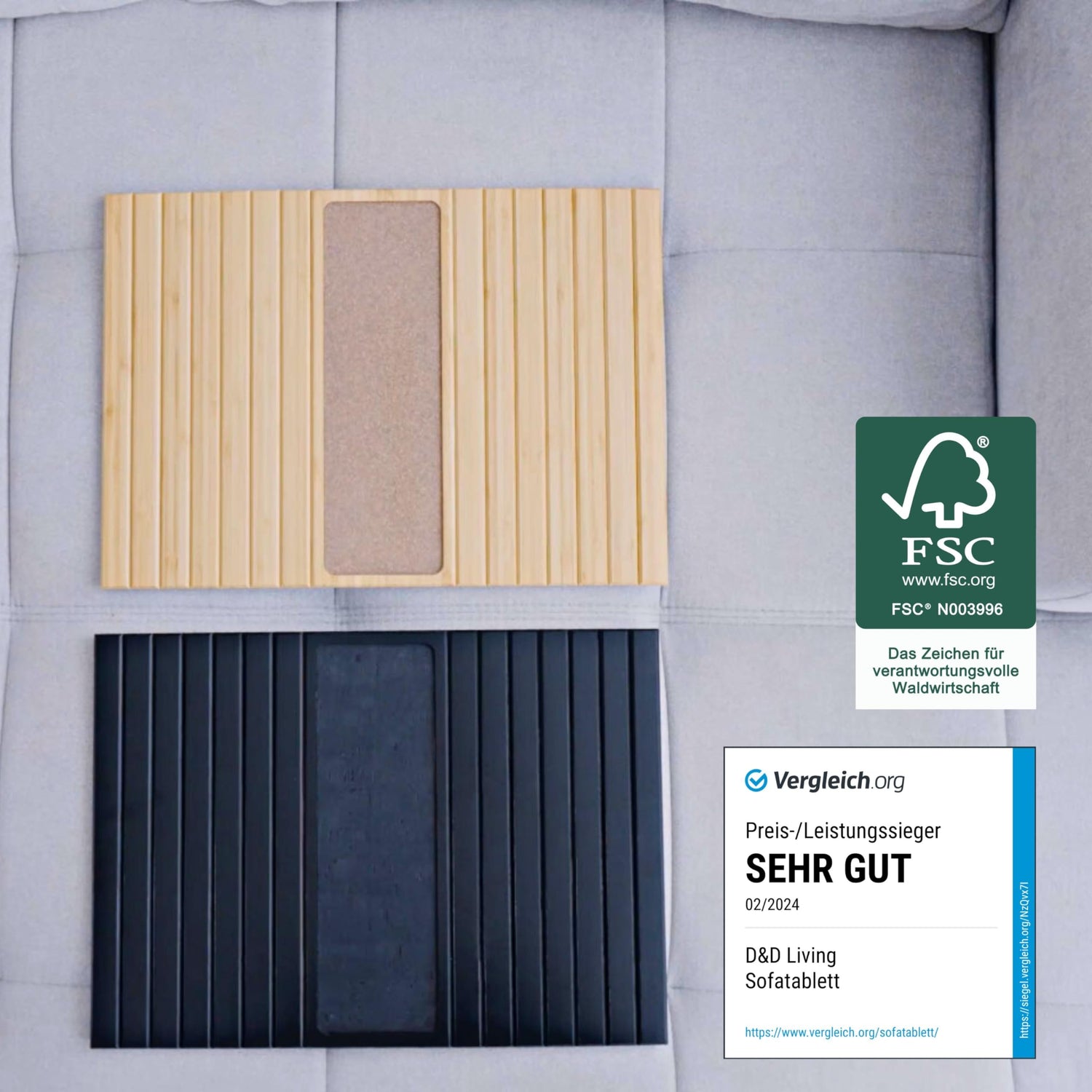 D&D Living® Sofatablett - Couch Ablage flexibel für Armlehne mit Anti-Rutsch Kork Pad | Tablett für Sofa mit 47x34 cm, nachhaltiges Bambus Schwarz Groß