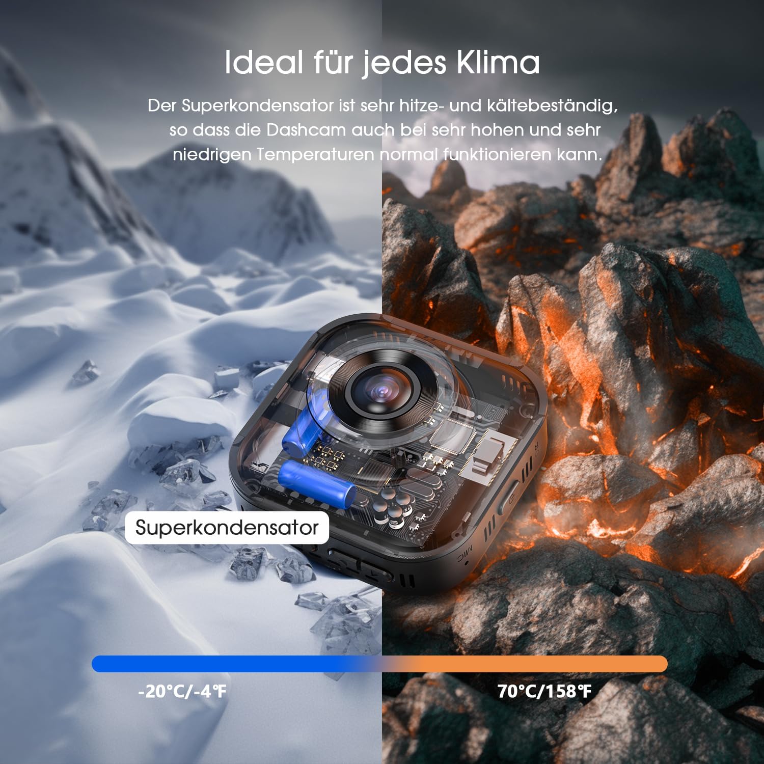 • Superkondensator:Superkondensatoren, die oft in hochwertigen Dashcams zu finden sind. Sie speichern Energie effizient und haben eine längere Lebensdauer, wodurch die Nutzung um bis zu 30% verlängert wird. Darüber hinaus zeichnen sie sich durch bemerkenswerte Toleranz gegenüber extremer Hitze und Kälte sowie erhöhte Stabilität aus, was sie zu einer sichereren Wahl macht.(Hinweis:Stromversorgung durch Zündung des Fahrzeugs.)