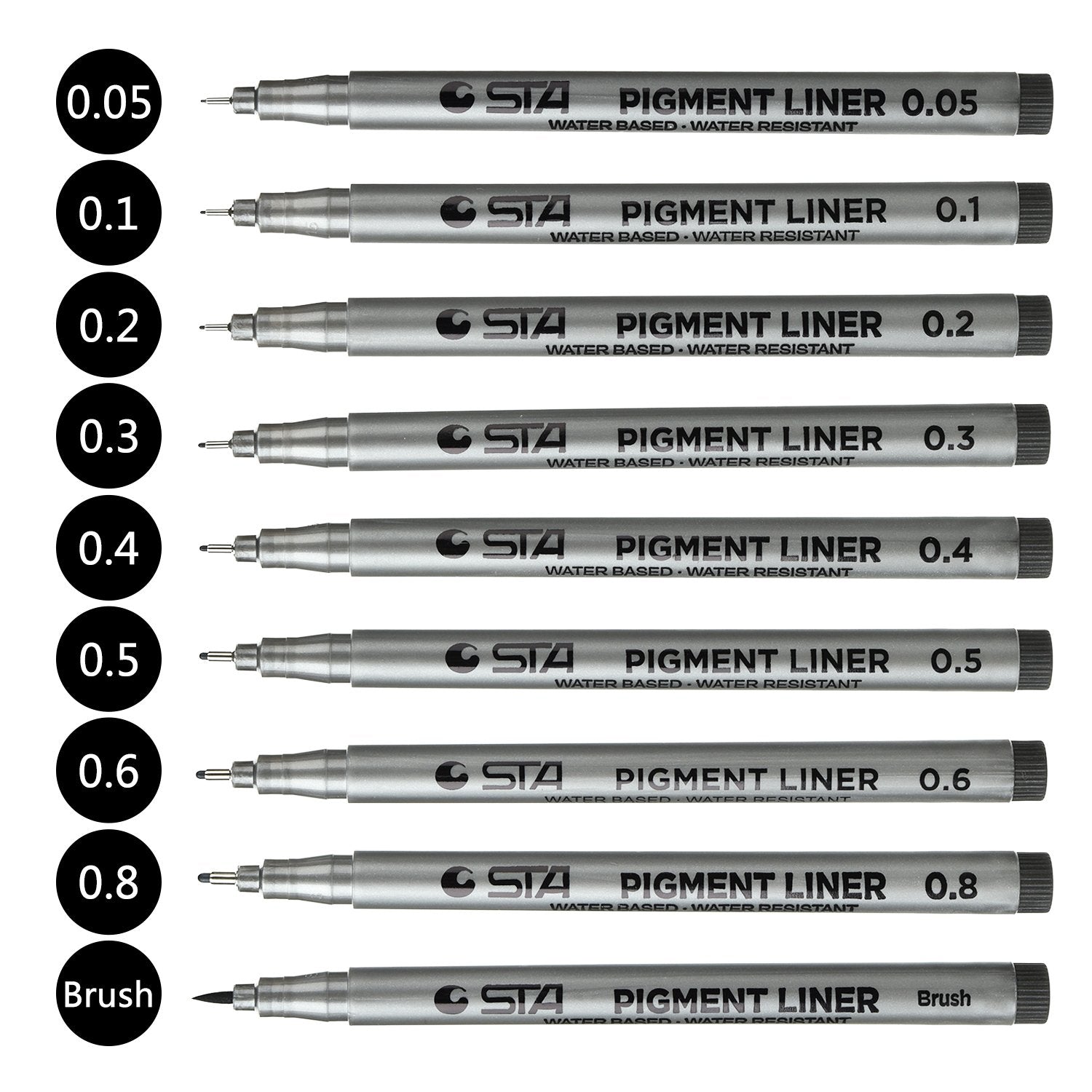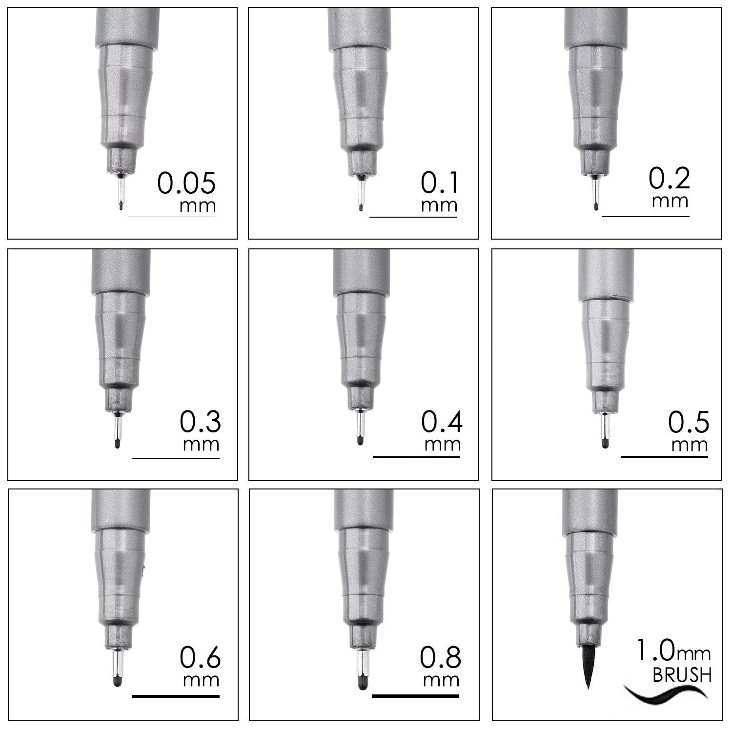 • 9er-Set: Multiliner-Stifte mit extra feiner Spitze in den Größen (0,05 mm, 0,1 mm, 0,2 mm, 0,3 mm, 0,4 mm, 0,5 mm, 0,6 mm, 0,8 mm und Pinselspitze 1 mm) die für alle Anwendungen geeignet sind