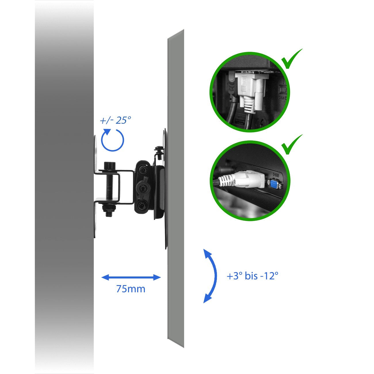 • deleyCON Universal TV & Monitor Wandhalterung // 13" - 27" Zoll (33cm - 69cm) // Belastbar bis max. 20Kg // Geringer Wandabstand von nur 75mm // Neigbar -12° / +3° // Schwenkbar +/- 25° // Massive Ausführung zur sicheren und stabilen Befestigung