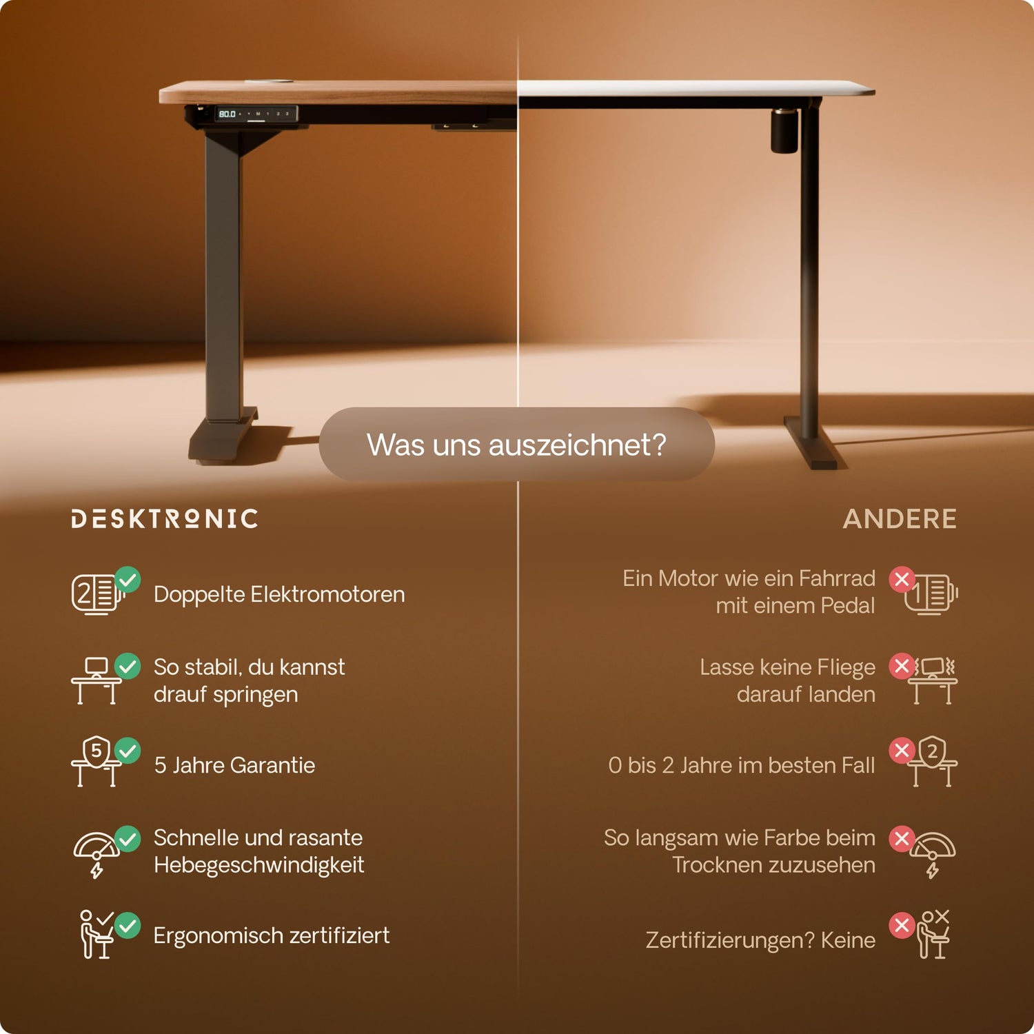 • Unser versprechen an sie: Bei Desktronic fertigen wir die hochwertigsten & leistungsstärksten Schreibtische & Arbeitsplätze. Die zufriedenheit unserer Kunden hat für uns oberste Priorität. Wenn unser Desktronic höhenverstellbarer Schreibtisch nicht alle Ihre Erwartungen erfüllt werden wir eine Lösung finden – denn ein elektrisch verstellbarer Schreibtisch sollte komfortabel und hochfunktional sein – wie ein ergonomischer Schreibtisch von Desktronic