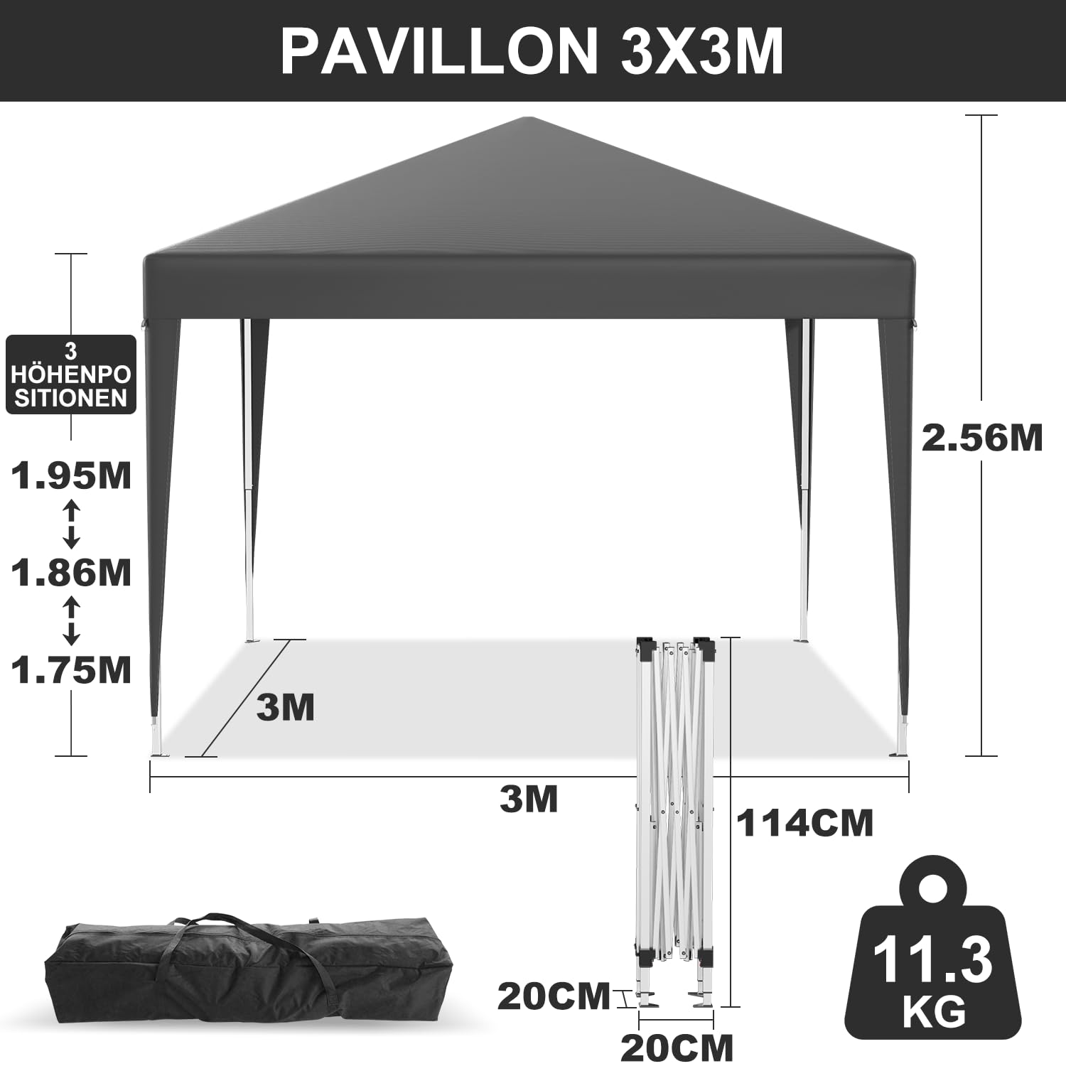 Devoko Pavillon Wasserfest 3x3m Wasserdicht Stabil | Faltpavillon Faltbar Gartenzelt | Pop up Faltbar Partyzelt UV Schutz 50+ | Höhenverstellbar | Metall-Verstrebungen für Camping(Grau)