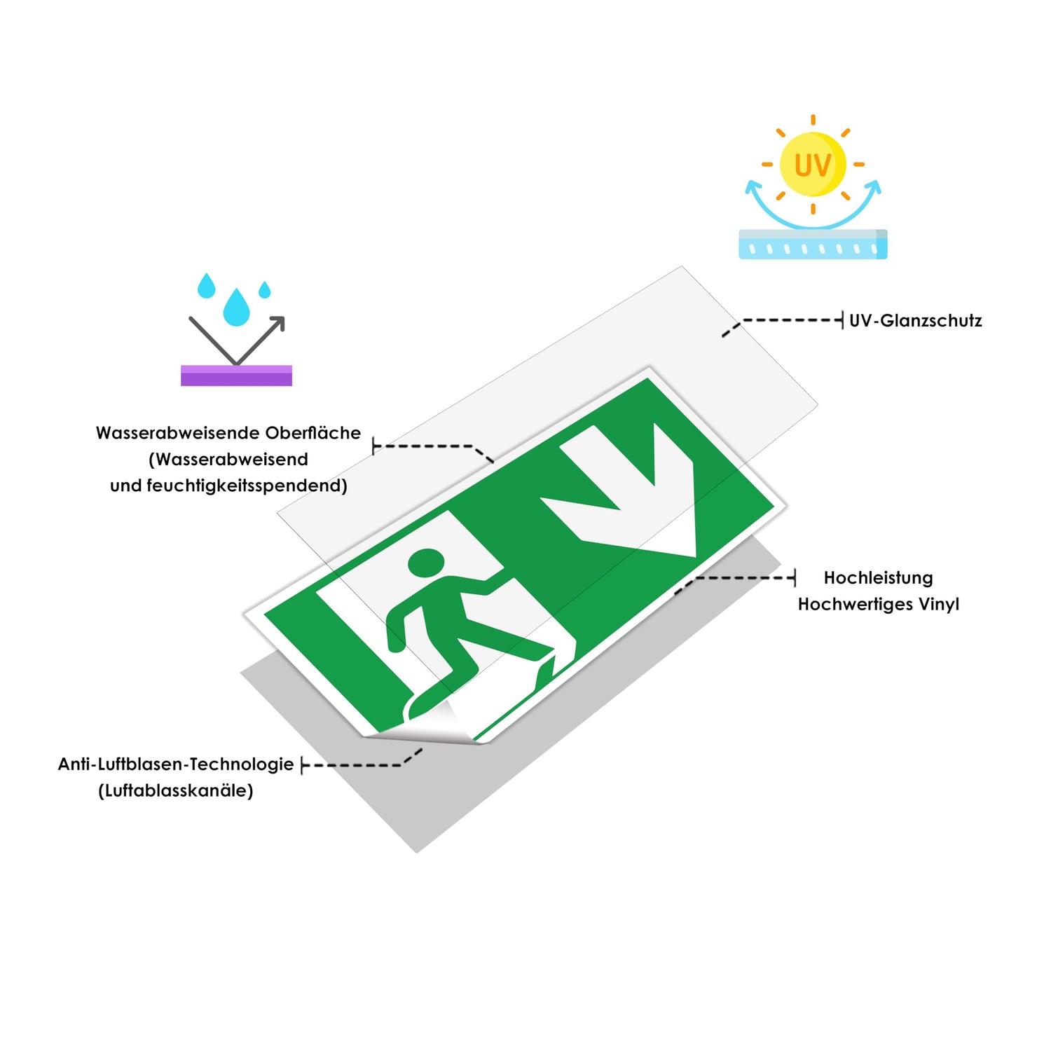 • Wetterbeständig: Ob regnerisch, windig oder stürmisch, dieses Notausgangsschild bleibt intakt und lesbar. Die Notausgangsschilder selbstklebend sind so konzipiert, dass sie verschiedenen Wetterbedingungen standhalten und in jedem Klima stets eine sichere Ausgangsmeldung vermitteln.