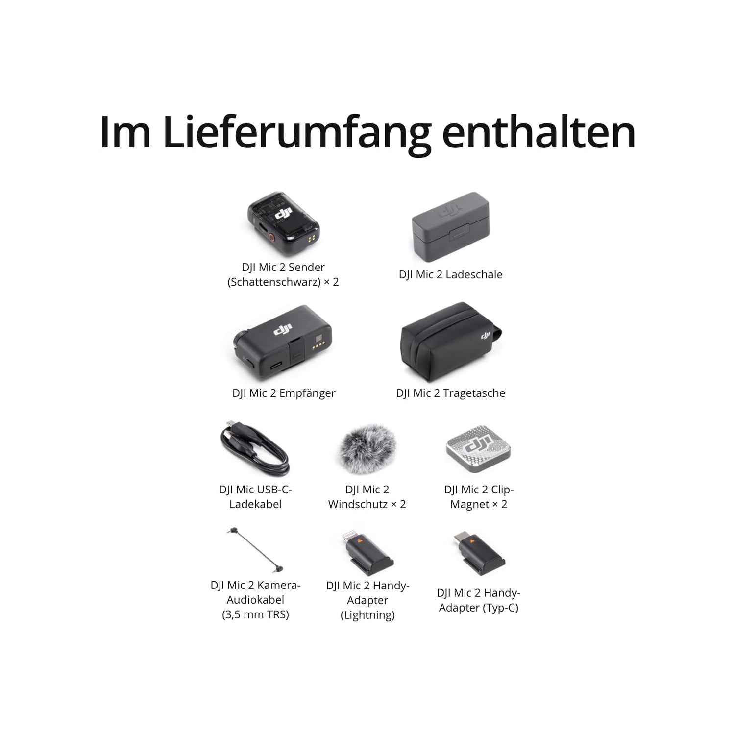 – Mic 2 (2 Sender + 1 Empfänger) – enthält 1 Empfänger, 1 Sender (Schattenschwarz), 1 Tragebeutel und mehr. Ideal für Solo-Kameraleute.
