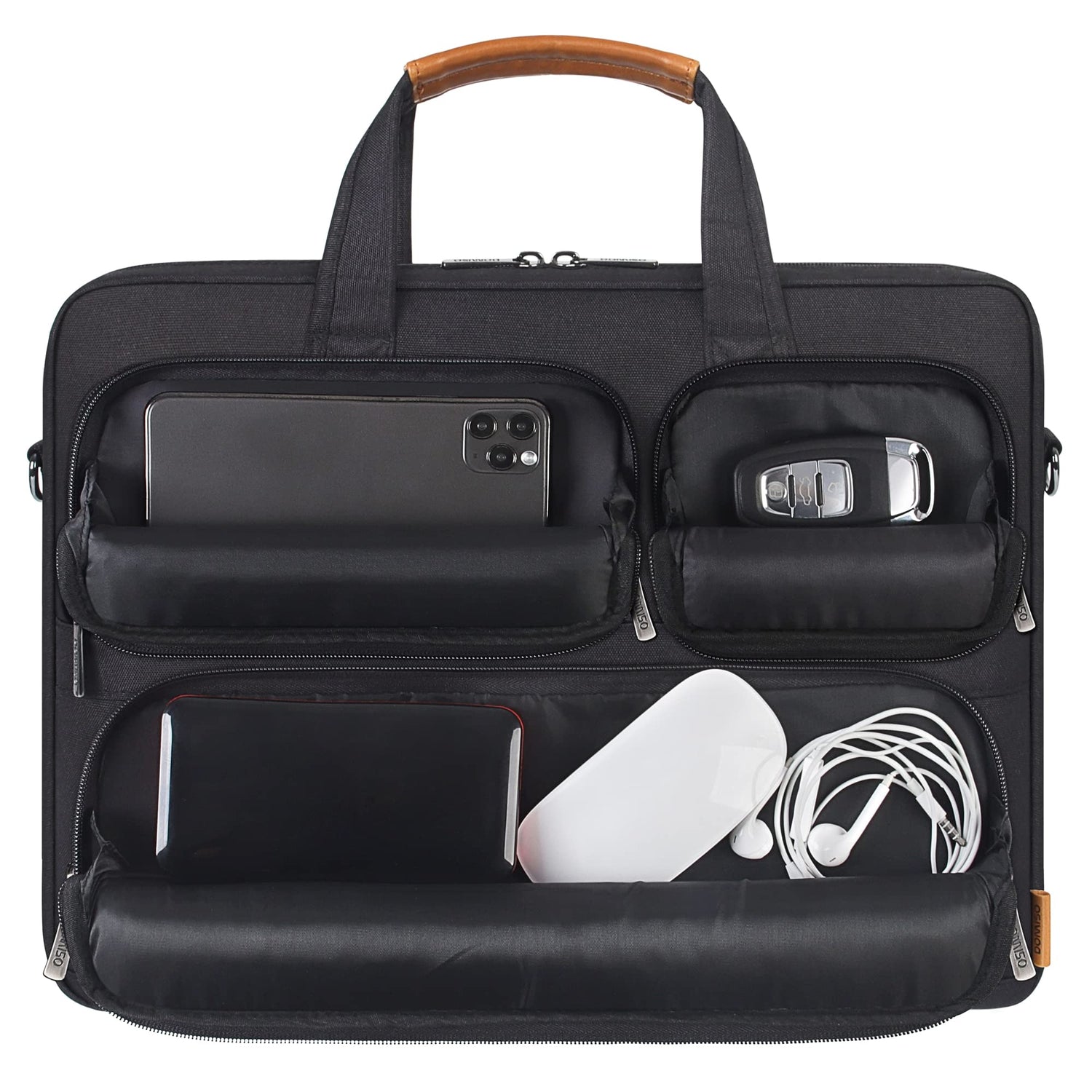 • Grosse KapazitäT: Die Haupttasche ist mit einem stoßfesten Fach ausgestattet, in dem Sie bequem Laptops, Bücher, Dokumente und Geldbörsen aufbewahren können. An der Vorderseite der Tasche befinden sich 3 Zubehörtaschen, die für die Aufbewahrung von kleinem Zubehör wie Mobiltelefon, Maus, Ladegerät, Bluetooth-Kopfhörer usw. vorgesehen sind.