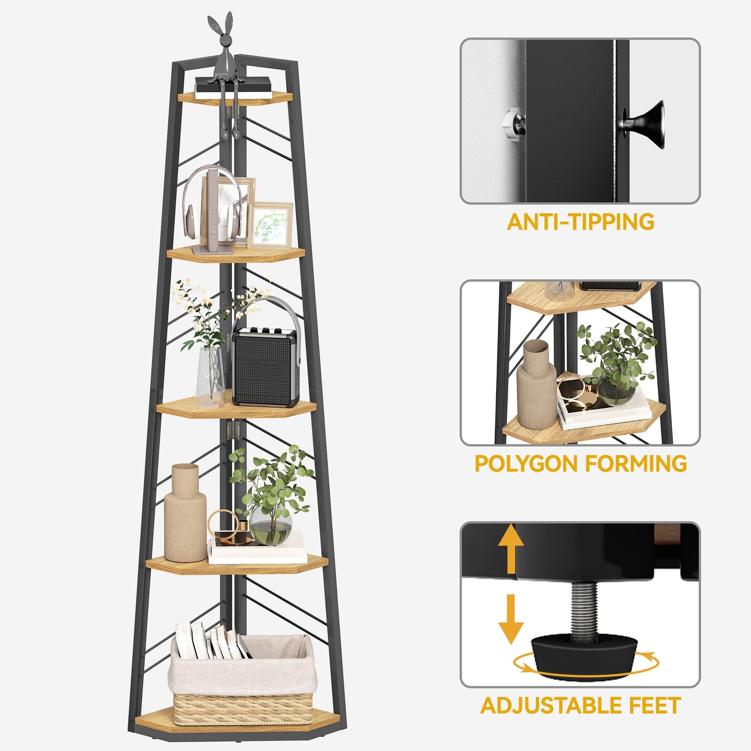Das DWVO Eckregal mit 5 Ebenen in warmer Eichenfarbe ist ein platzsparendes Highlight für enge Ecken in Wohnzimmer, Küche, Schlafzimmer, Home-Office, Flur, Balkon oder Bad. Dieses bodenständige Displayregal im Industrial-Ladder-Design mit verstärktem Metallrahmen und dicken Kunstholzplatten maximiert den Stauraum, ohne den Raum zu belasten. Ideal als Eckbuchregal für Bücher, Dekoartikel, Pflanzen, Ordner oder Alltagsgegenstände – für eine übersichtliche und stilvolle Organisation.