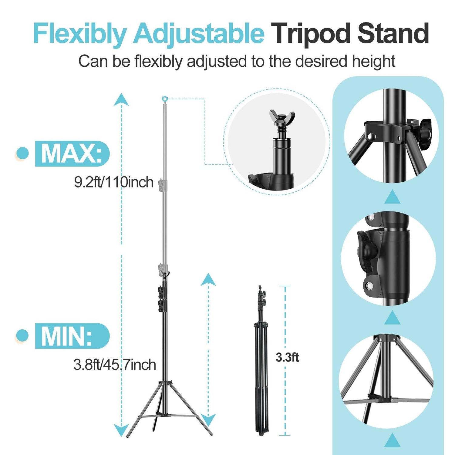 • Das Set beinhaltet: (4) x Durchmesser Querstange, (2) x 2,8m Robuster Lichtständer aus Aluminiumlegierung, (2) x 11,4cm Robuste Federklemmen, (1) x tragbare Tragetasche.