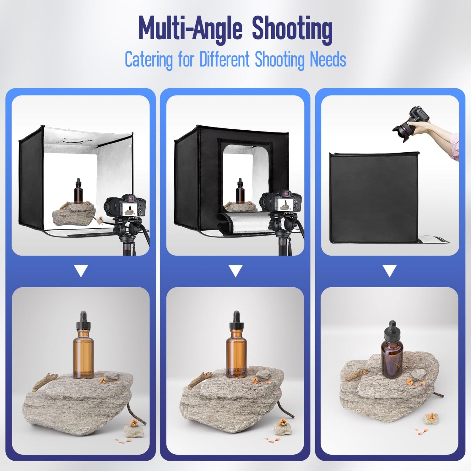 • Große Größe Design: Die Größe dieser Fotokabinenbox ist 50x50cm, die für die meisten kleinen und mittelgroßen Produkte sowie einige Close-up-Produkte geeignet ist, wie Schmuck, Kunsthandwerk, Kosmetik, Spielzeug, Lebensmittel und so weiter, Sie brauchen nur eine Lichtbox, um Ihre Nutzungsanforderungen zu erfüllen