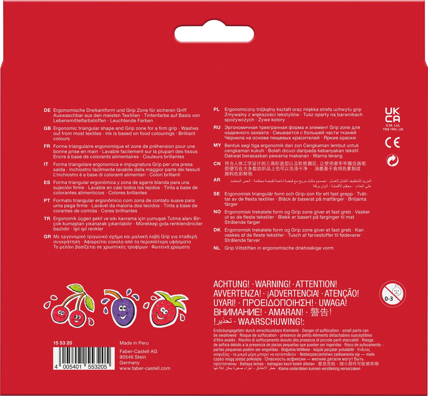 Der Faber-Castell GRIP Colour Marker hat eine ergonomische Dreikantform mit einer Noppen-Oberfläche, die für sicheren, rutschfesten und angenehmen Halt sorgt. Die Tintenfarbe basiert auf Lebensmittelfarbstoffen. Die robuste Spitze hält bis zu 3 kg Maldruck stand. Die leuchtkräftige Farben sind auswaschbar aus den meisten Textilien. Im Etui sind 20 verschiedenen Farben enthalten.