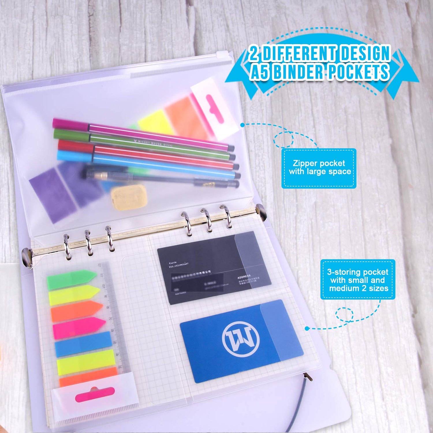 • 【A5 Nachfüllpapier Set】-Lieferumfang: 2 Packungen A5 karierte nachfüllbare Notizpapier=90 Blätter/180 Seiten|5 Stücke farbige Trennblätter A5|3 Stücke Haftnotizen Bunt=460 Blätter|1 Stück Reißverschlussumschläge|1 Stück Umschläge mit 3 kleinen getrennten Taschen