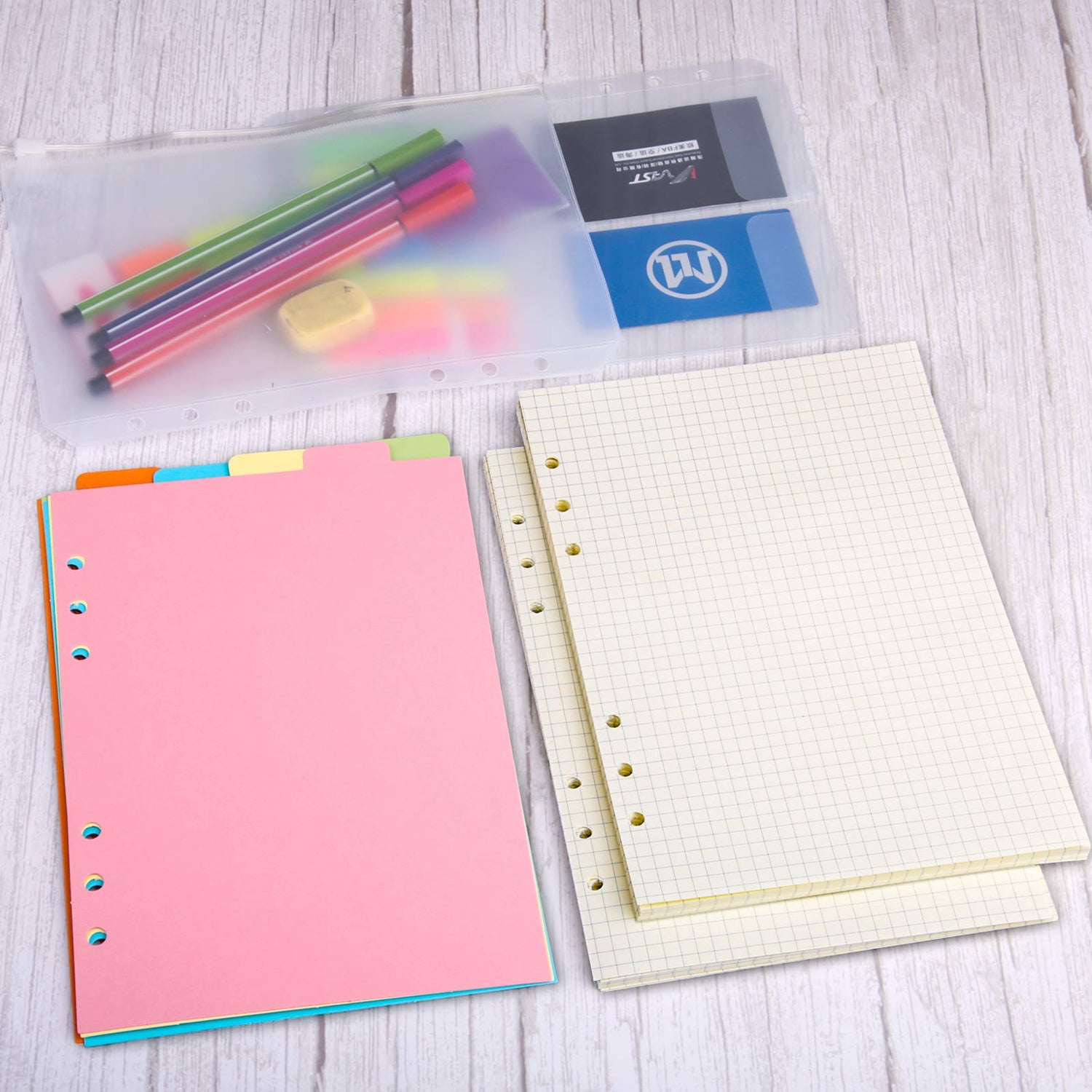 FANDAMEI A5 Karierte Nachfüllbare Notizpapier Set, 2 Packe 6 Löcher A5 Nachfüllpapier 90 Blätter, 5 Stücke Farbige Trennblätter A5, 460 Stücke Haftnotizen Bunt, 2 Stücke Umschlägbeutel A5