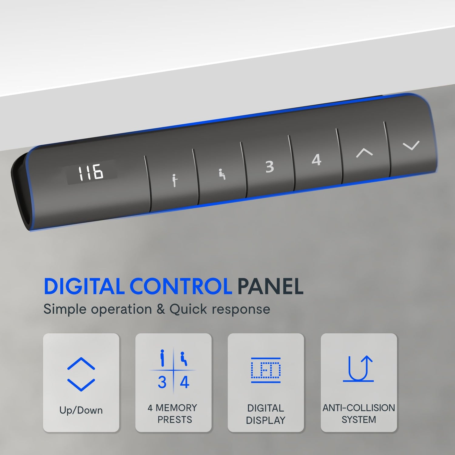 Das Gestell ist kompatibel mit Tischplatten von 120–180 cm Länge, 60–80 cm Breite und ab 18 mm Dicke – so kannst du deinen Arbeitsplatz individuell gestalten. Für maximale Sicherheit sorgt das integrierte Anti-Kollisionssystem, das bei Widerstand sofort stoppt und zurückfährt – ideal für Haushalte mit Kindern oder Haustieren.