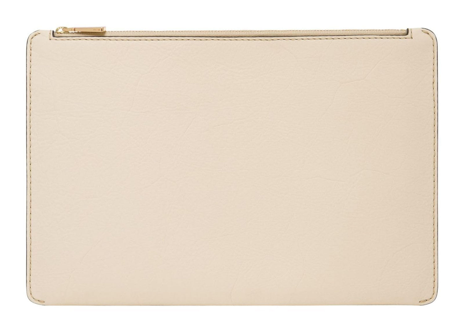 Diese Pouch aus Eco-Leder hat goldfarbene Beschläge.