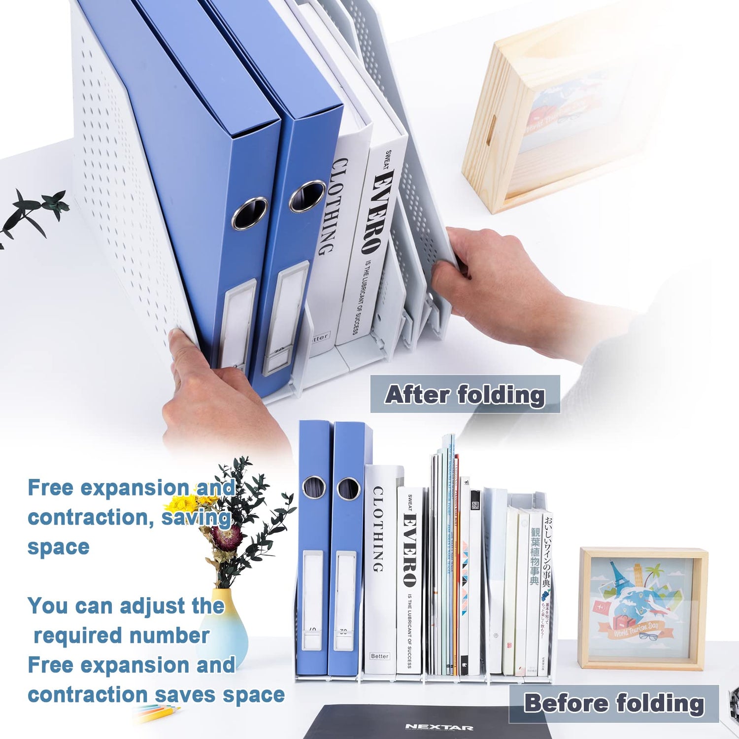 • ✯【Schreibtisch Organizer】: Faltbarer A4-Zeitschriftenständer, einfach zu installieren und einzustellen, die Breite kann je nach Nutzungsszene angepasst werden, die Mindestbreite nach dem Zusammenklappen beträgt ca. 5,5 cm, einfach zu verstauen und zu tragen.