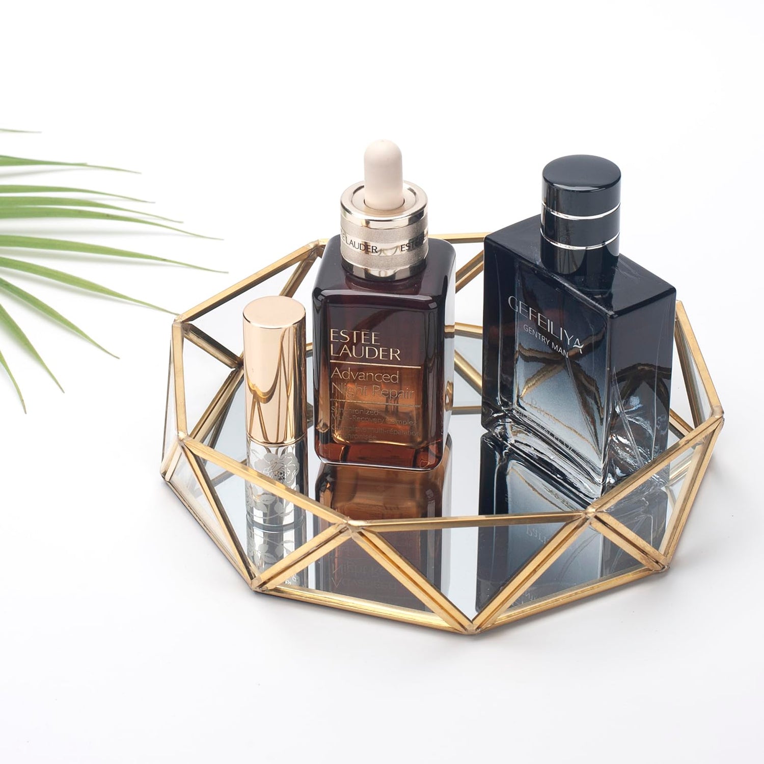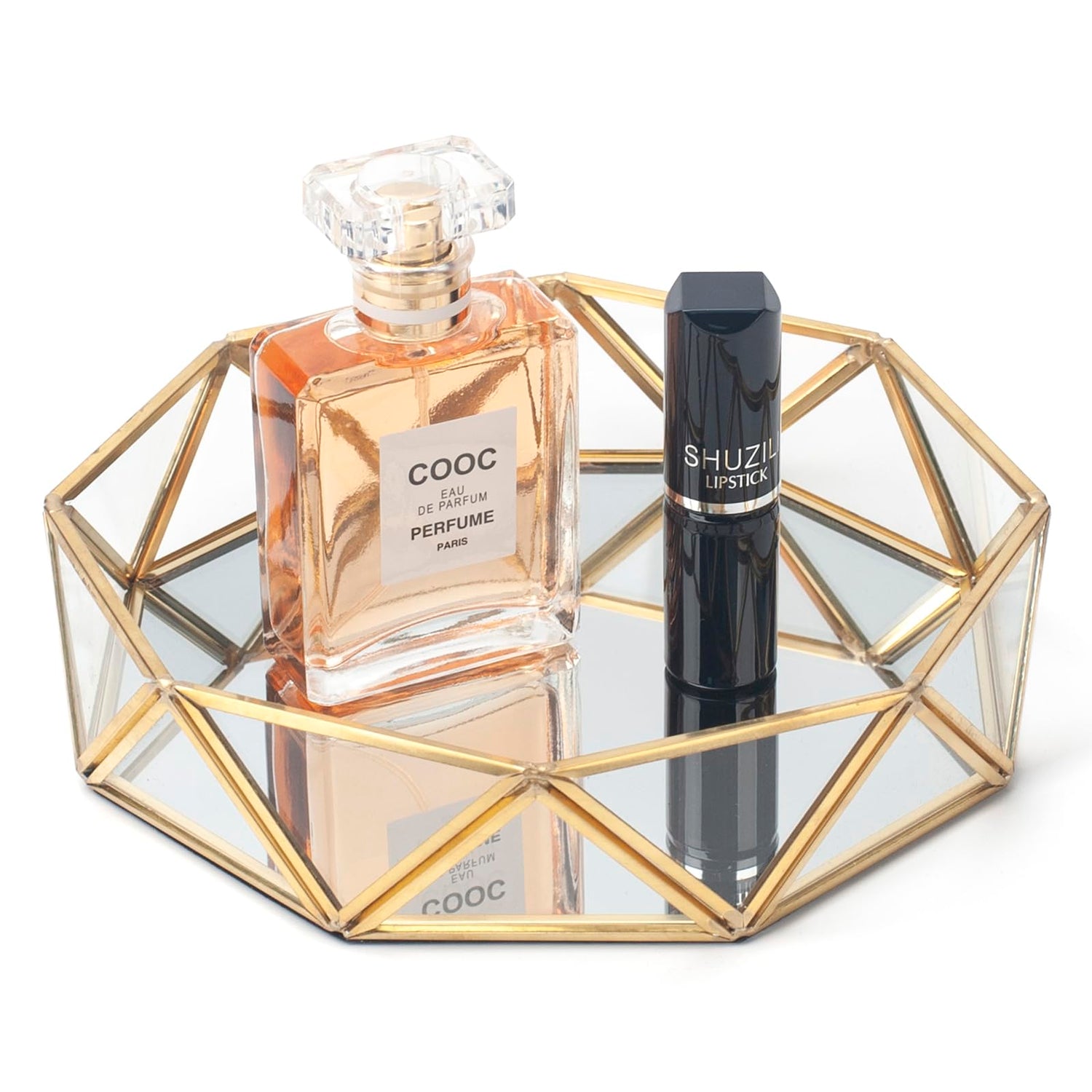• Material: Das parfüm tablett besteht aus glas und messing, der metallrahmen ist sorgfältig verarbeitet und handgeschweißt, langlebig und robust, boden anti-rutsch pad schützt Ihren tisch vor kratzern, klares glas und spiegeloberfläche macht das make-up tablett elegant und modern, was Ihrer eitelkeit-arbeitsplatte fortschrittlichen sinn verleiht.