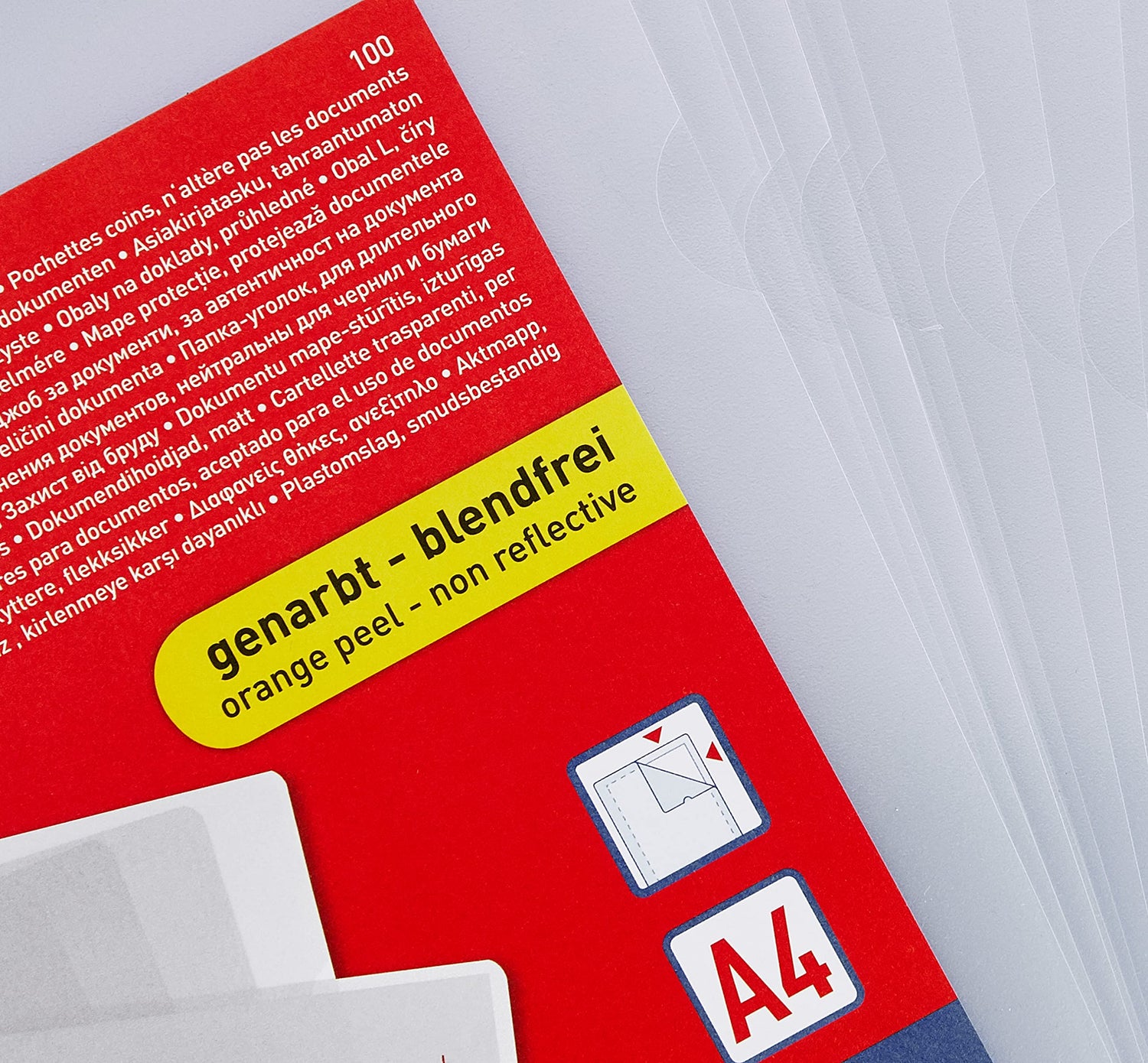 Einzelheiten: Aktenhülle A4 Standard genarbt 100er. Ausführung: dokumentenecht, Hüllen strapazierfähig, Greifausschnitt vorhanden, Kantenschweißnaht vorhanden. Verwendung für Papierformate: A4. Ausführung der Oberflächen-Beschaffenheit: genarbt. Werkstoff: PP. Stärke: 0,110 mm. Farbe: transparent. Art der Verpackung und Inhalt: Beutel mit 100 Stück.