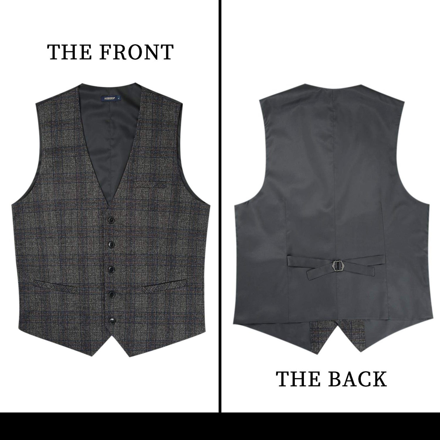 • Karierte Weste Eigenschaften: V-Ausschnitt + 3 echtes Einstecktuch + 5 Knöpfe + verstellbarer Rückengurt. Der Rückenriemen lässt sich mit der Metallschnalle leicht bewegen und einstellen, die Nähte sind versteckt und fest und die Passform ist gut.