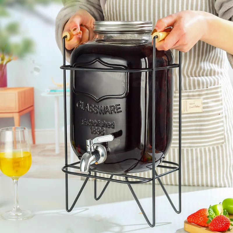• Packung und Spezifikationen: 1Pcs 4L Glas Getränkedosierflasche mit Deckel, Eisen Stand, Edelstahl-Hahn. Empfohlene Verwendung Temperatur≦45℃(113℉).