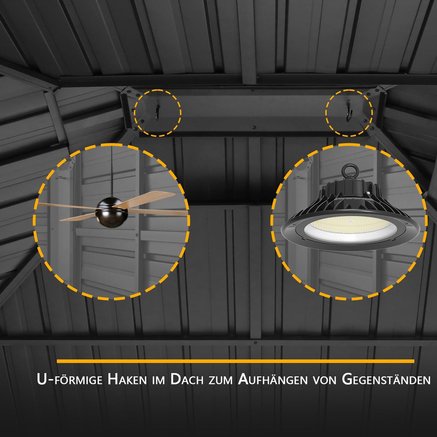 • 【VENTILIERTES DOPPELDACH】Unser Hardtop-Pavillon verfügt über ein hochbelastbares verzinktes Stahldach, das einen besseren Schutz vor schädlichen UV-Strahlen bietet und die Luftzirkulation und Windbeständigkeit fördert. Sie können sich sogar unter diesem Hardtop-Gazebo sonnen, ohne einen Sonnenbrand befürchten zu müssen.
