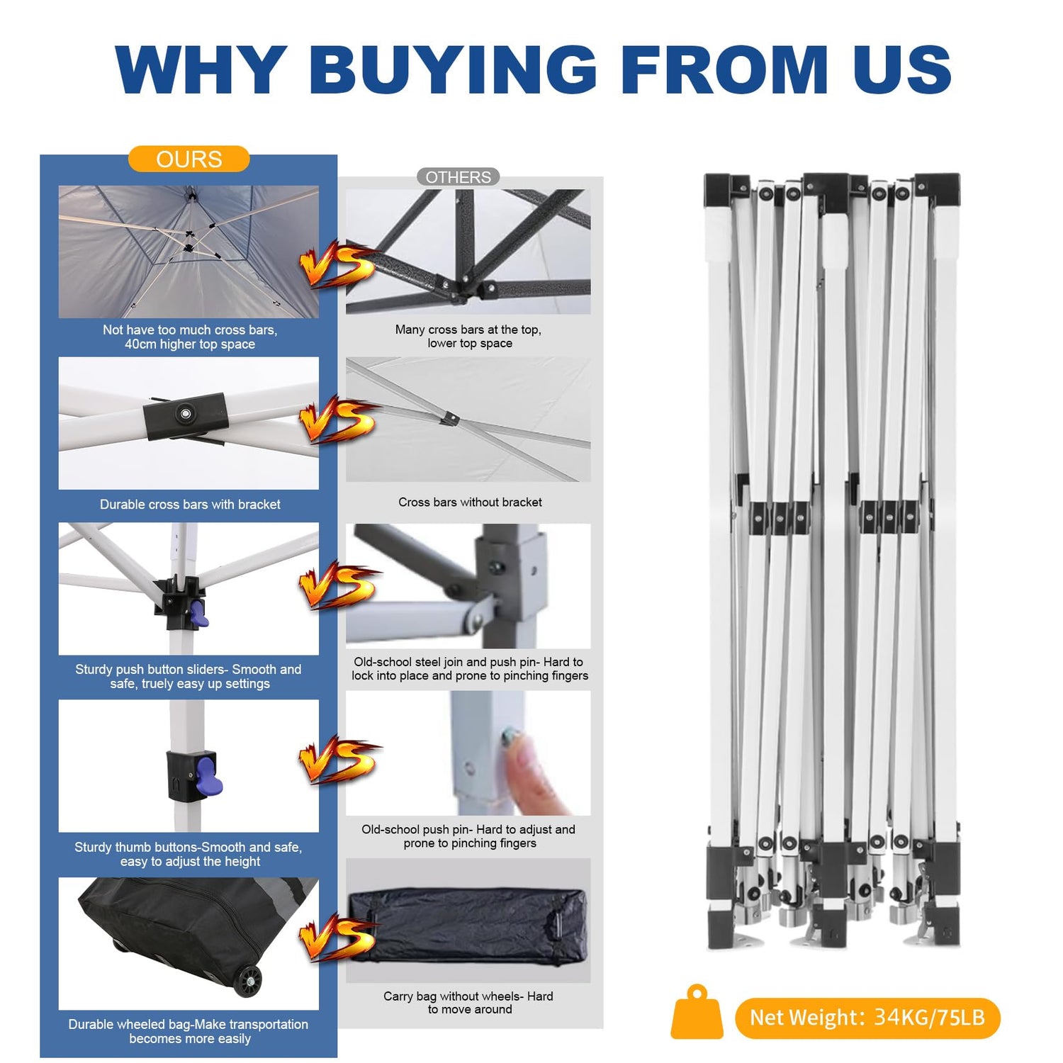 • 【Einfacher Auf- und Abbau】Pavillon mit seitenwänden kann von 2–4 Personen innerhalb weniger Minuten einfach auf- und abgebaut werden. Es ist groß genug für 3-4 lange Tische oder 15-20 Personen. Das verbesserte Daumenknopf-Design am Bein erleichtert das Verriegeln und Lösen und schützt die Finger vor einklemmungen.