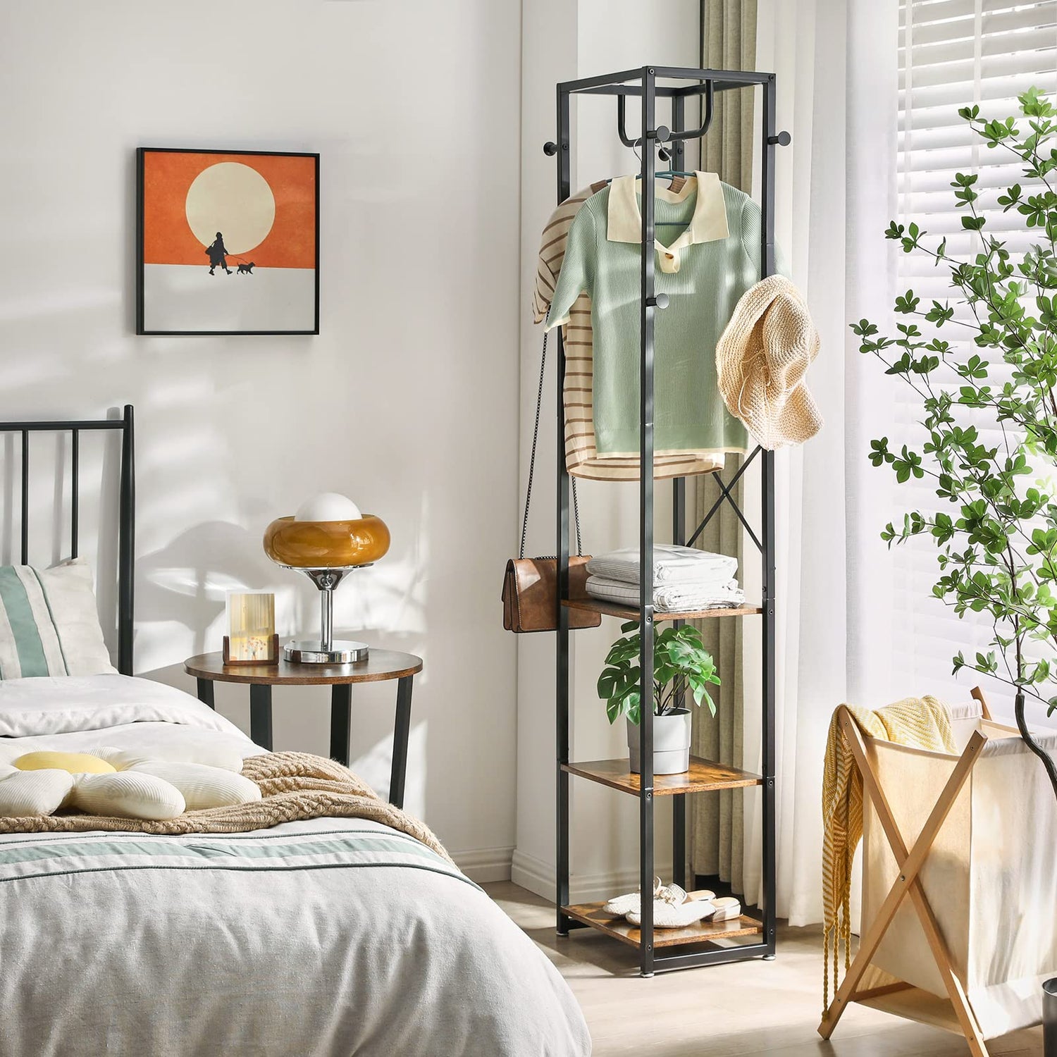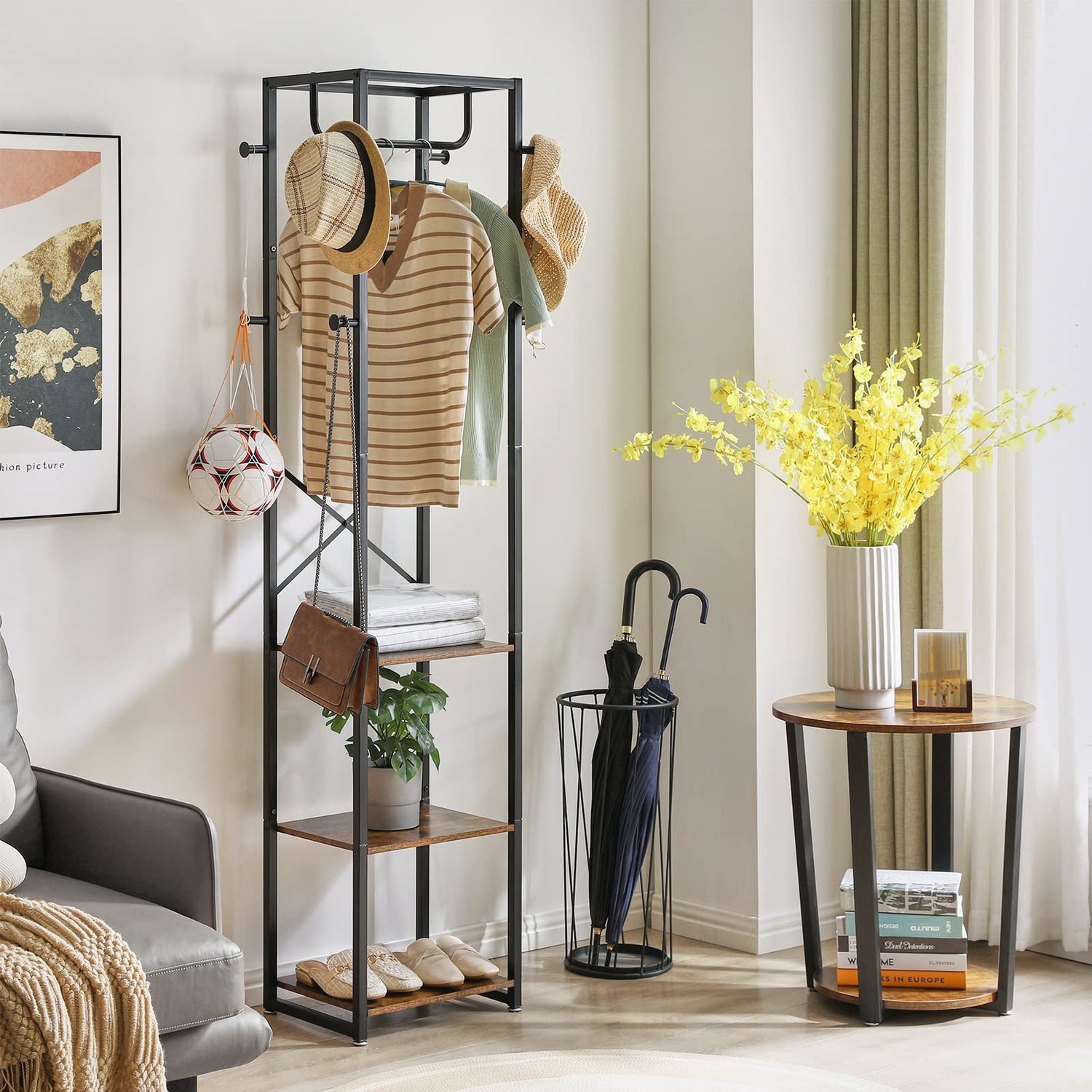 IBUYKE Garderobenständer, Kleiderständer mit 3 Ablagen und 8 Haken, Freistehende Garderobe, Industrie-Stil, für Schals, Taschen, Regenschirme und Boxen, Vintagebraun-schwarz TMJ088H
