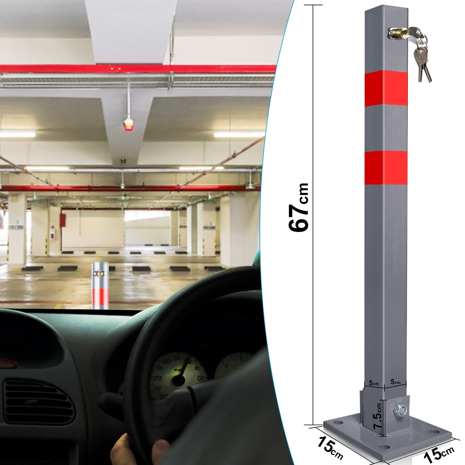 • 🏎️Befestigungsmaterial kann über einen Sockel im Boden befestigt werden - Sicherer Stand und praktischer Schutz vor Falschparkern.