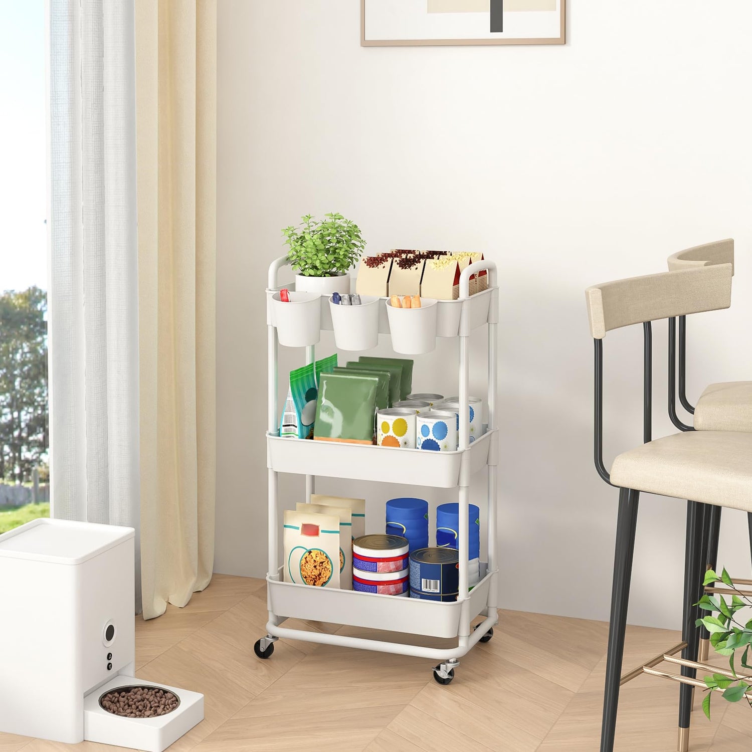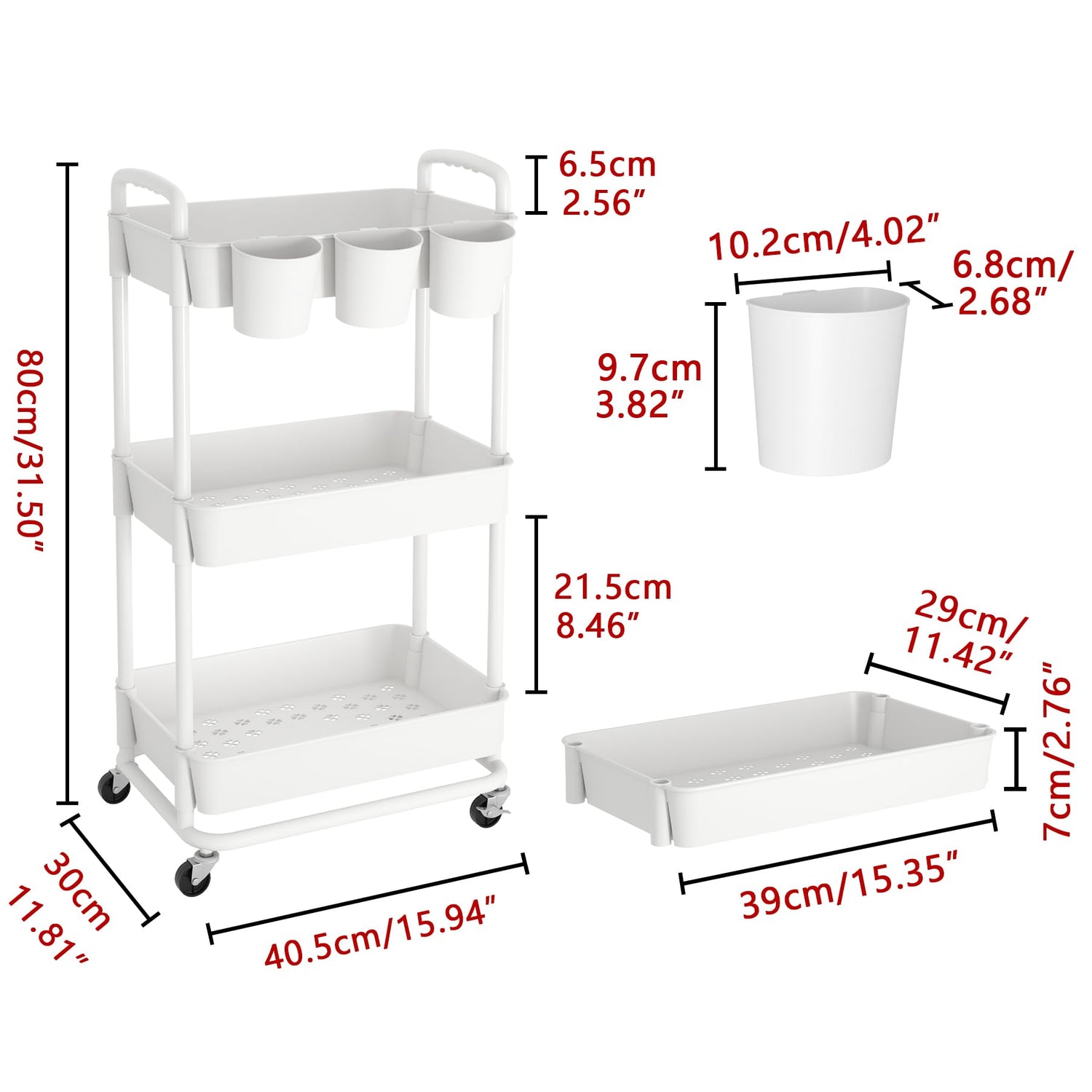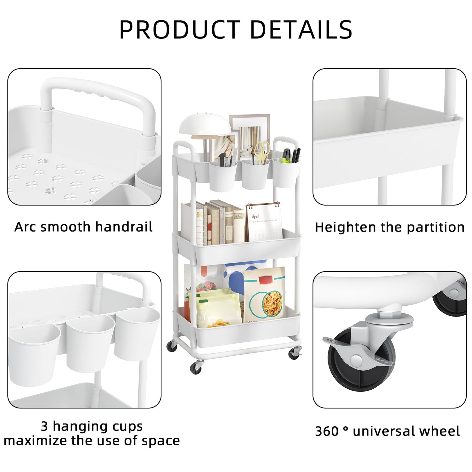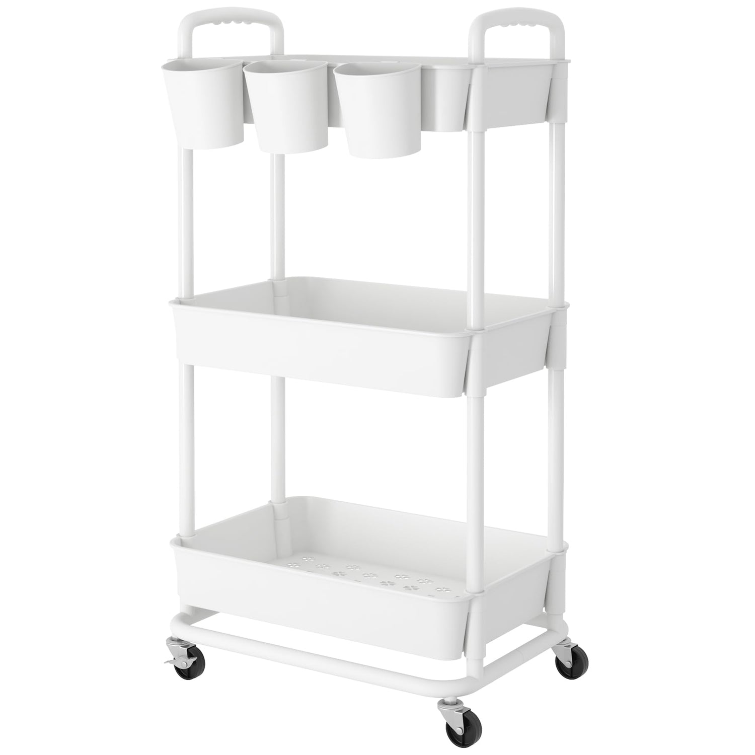 JIUYOTREE Rollwagen mit 3 Ebenen, Kunststoff, mit extra hängenden Bechern, Griffen, abschließbare Räder, für Wohnzimmer, Badezimmer, Küche, Büro, Weiß