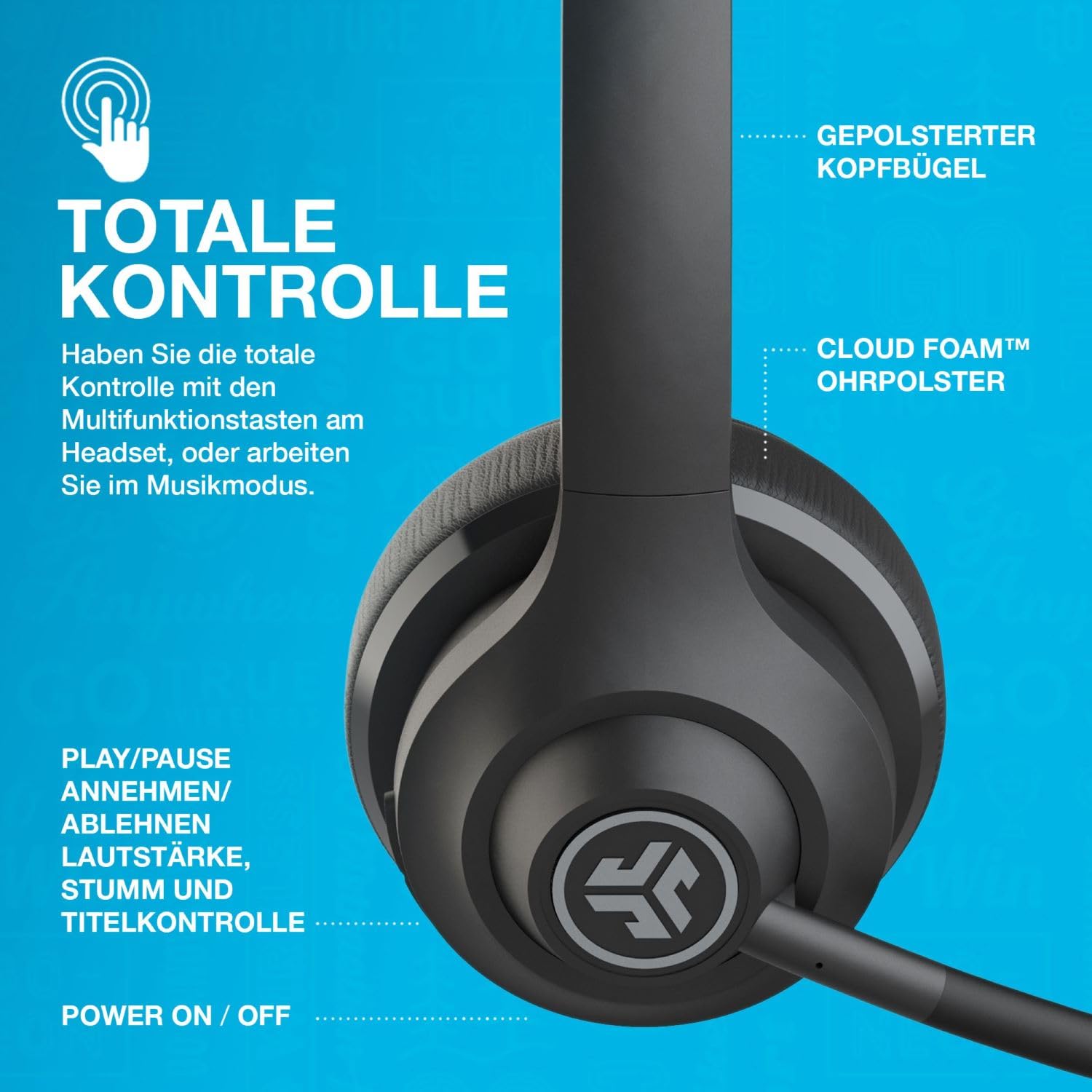 • DAS HEADSET MIT MIKROFON ENTHÄLT: GO Work On-Ear Office- oder Gaming Headset kabellos, Typ-C auf Typ-C-Kabel für kabelgebundene Nutzung, JLab 2-jährige Garantie. Perfekt für den Büroalltag oder das Home Office! Genießen Sie Anrufe und Teams oder Zoom-Videogespräche und eine praktische optische Anzeige der Stummschaltung am Ende des Bügelmikrofons