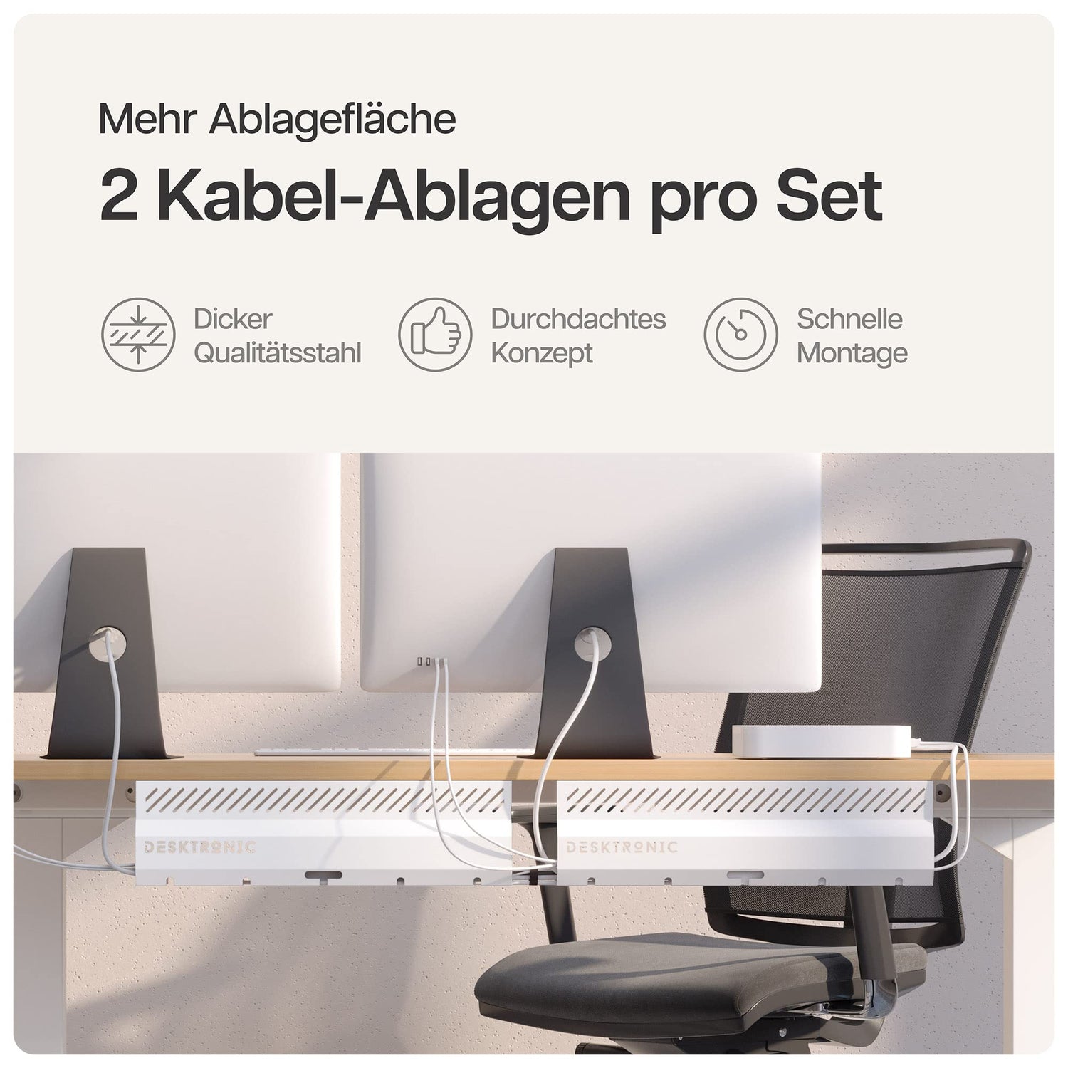 Kabelkanal Schreibtisch Weiß 2er Set - Edelstahl Kabelmanagement Schreibtisch Kabelkanal mit 5 Kabelausschnitten - Einfach zu Installierender Kabel-Organizer - Kabelhalter von Desktronic