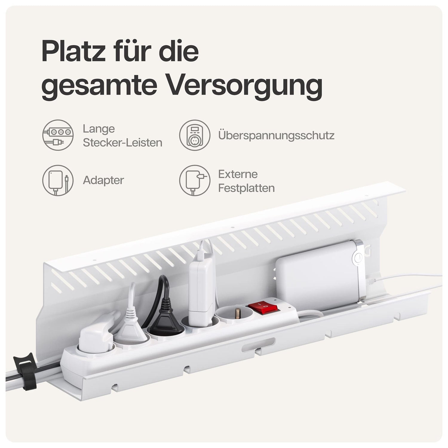 • Die durchschnittliche kabelorganisation besteht aus minderwertigen Materialen die sich unter dem Gewicht Ihrer Kabel leicht verbiegen oder brechen. Das Schreibtisch Kabel Halter Set von Desktronic besteht aus dickem stabilem edelstahl mit einer schützenden pulverbeschichtung um Kratzer zu vermeiden. Dieser robuste geräumige Kabelsammler mit den Maßen 43 x 12 x 10 cm hält problemlos mehrere Steckdosenleisten Laptop-Netzteile Überspannungsschutz Netzteile und externe Festplatten.