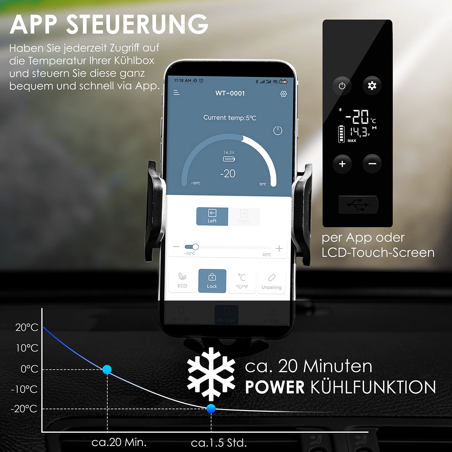 • 𝐁𝐄𝐐𝐔𝐄𝐌𝐄 𝐁𝐄𝐃𝐈𝐄𝐍𝐔𝐍𝐆: Mit der integrierten APP Steuerung lässt sich die Temperatur der Kühlbox bequem und schnell steuern. Kühlen Sie die Gefrierbox dank der Power Kühlfunktion in ca. 20 Minuten von 20°C auf 0°C oder innerhalb von 1,5Std. auf eiskalte -20°C. Auch ohne APP lässt sich die der mobile Kühlschrank kinderleicht dank des modernen LCD-Touch-Screen bedienen. Wählen Sie zwischen dem Max-Mode für schnelles Kühlen oder dem Eco-Mode für einen sparsamen Kühlvorgang.