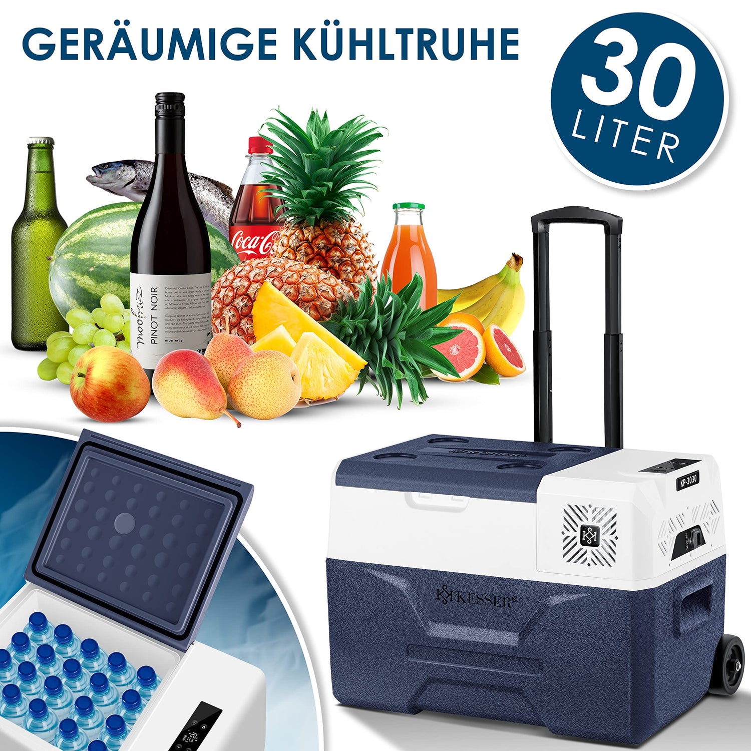 KESSER® Kompressor Kühlbox elektrisch Gefrierbox, 30 Liter Mit APP-Steuerung USB-Anschluss 12/24 V 230V, +Teleskopstange, 2x Kühlakkus Räder Kühlschrank Kühlung bis -20 °C für Auto, Lkw, Boot