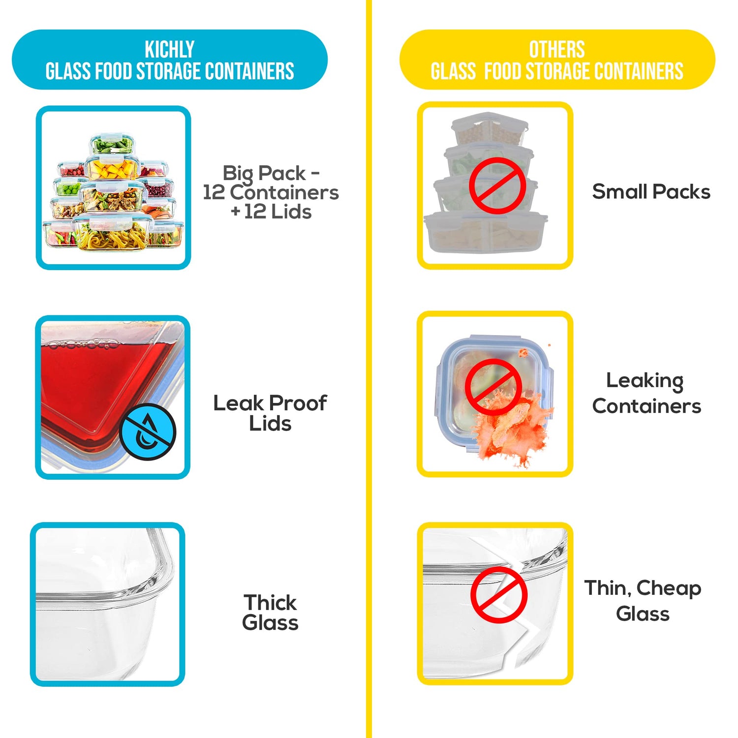 KICHLY Vorratsdosen für Lebensmittel aus Glas - Transparente Erstklassig Glasbehälter mit Deckel - Luftdicht, Auslaufsicher, BPA-frei - 24er (12 Behälter und 12 Deckel)