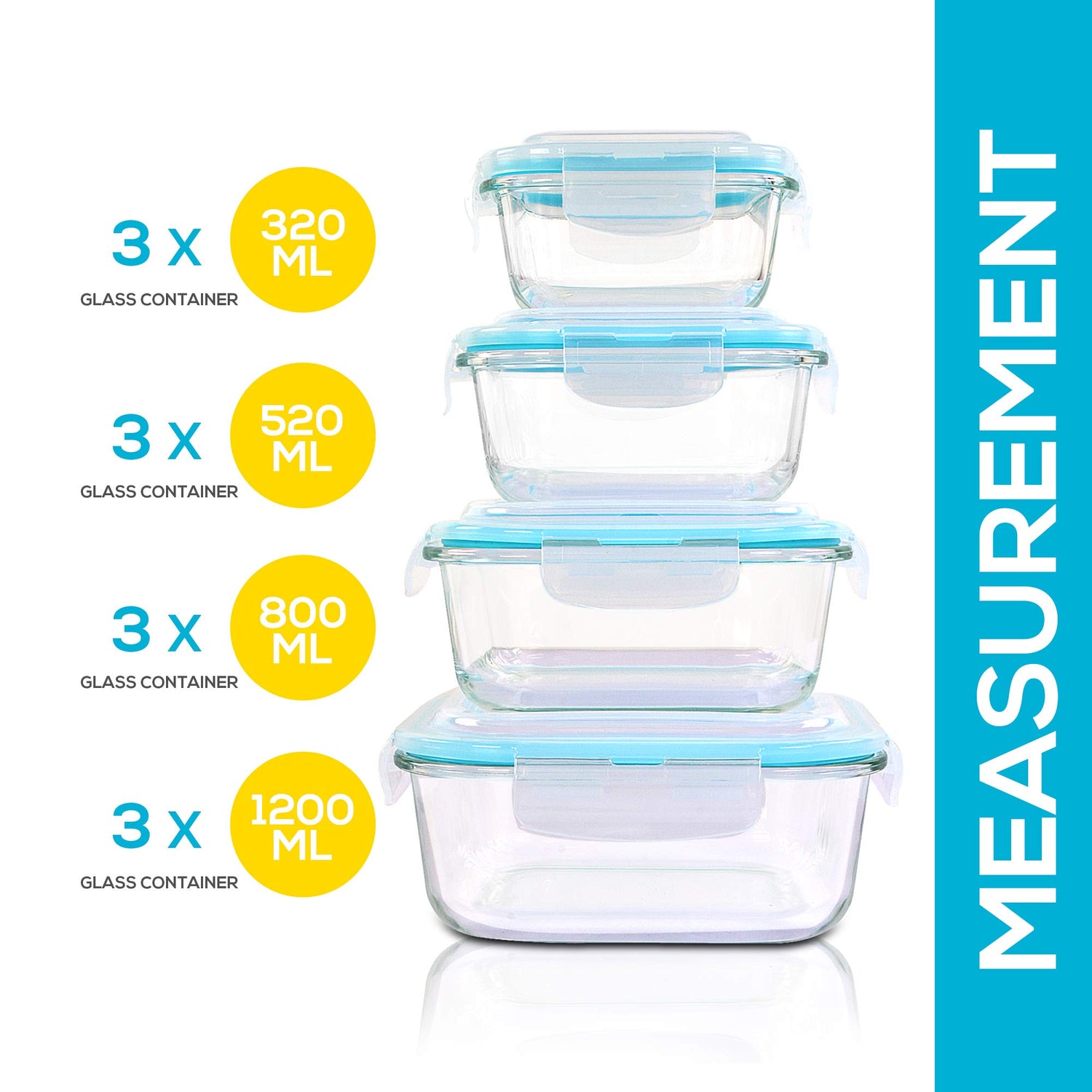 • Vorratsbehälterset - Dieses Set enthält 12 Glasbehälter und 12 transparente Kunststoffdeckel. Die Behälter sind in verschiedenen Größen erhältlich (320 ml, 520 ml, 800 ml und 1040 ml - jeweils 3 Stück.) und haben eine quadratische Form. Multifunktionale Verwendbarkeit - Einfrieren, Backen, Aufwärmen, Aufbewahren und Servieren