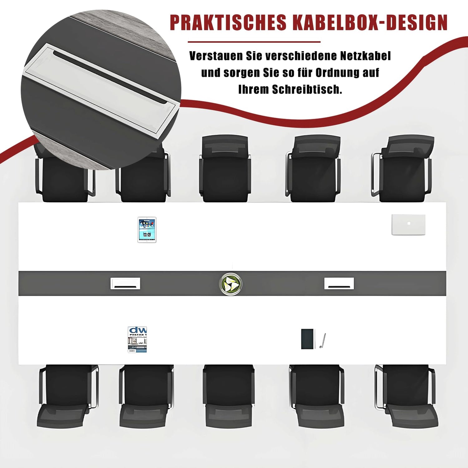 Tazyee Großer Konferenztisch Weiß Schwarz, Moderner Besprechungstisch mit Kabelmanagement und Höhenverstellbaren Füßen für 12 Personen