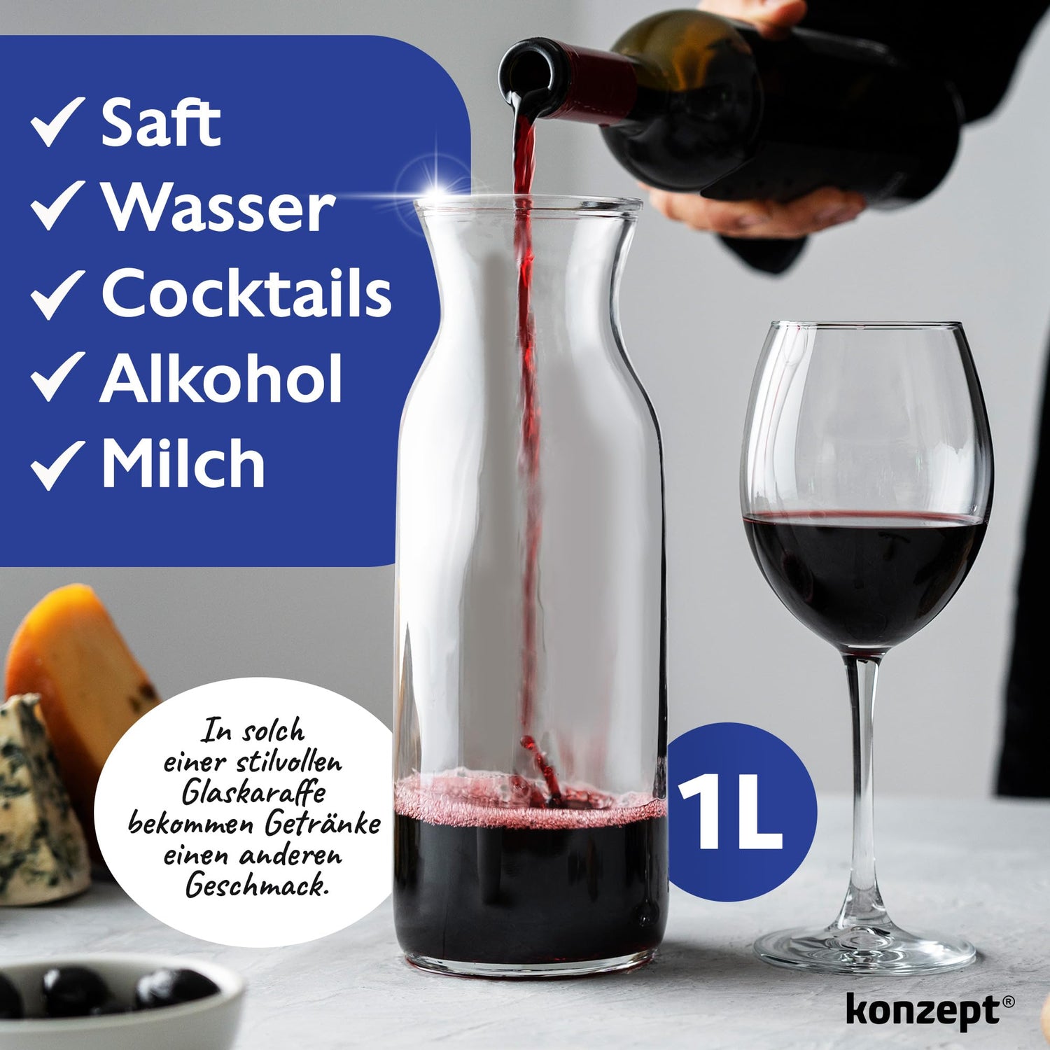 KONZEPT Wasserkaraffe ohne Deckel, Glaskaraffe 1 liter, Karaffe ideal für Wasser, Saft, Wein, Limonade, Coctails und Milch