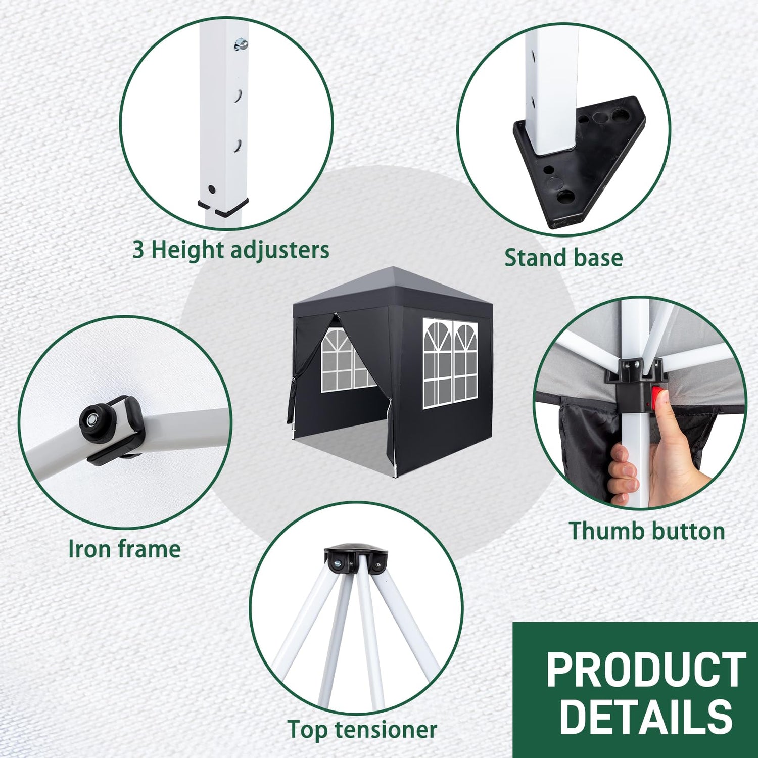 LEADZM 2x2m Pavillon,Pop-up,Winddicht,Wasserdicht,Faltpavillon,UV Schutz 50+,Höhenverstellbar,mit 4 Seitenteilen,für Outdoor, Garten, Party, Camping,Dunkelgrau