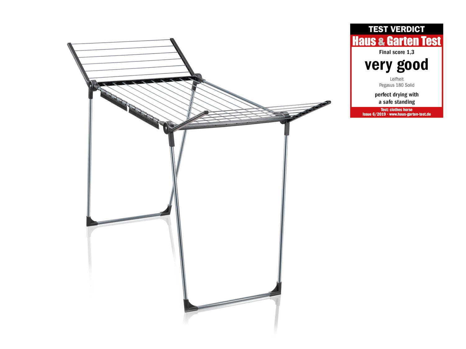 Die Produktvorteile im Überblick in modern schwarzem Design Parallele Standbeine für stabilen Stand des Trockners drinnen und draußen 105 cm hohe Flügel für lange Wäschestücke 18 Meter Trockenlänge bieten viel Platz für 1-2 Ladungen Wäsche platzsparend verstaubar 2 Kleinteilehalter Made in Germany