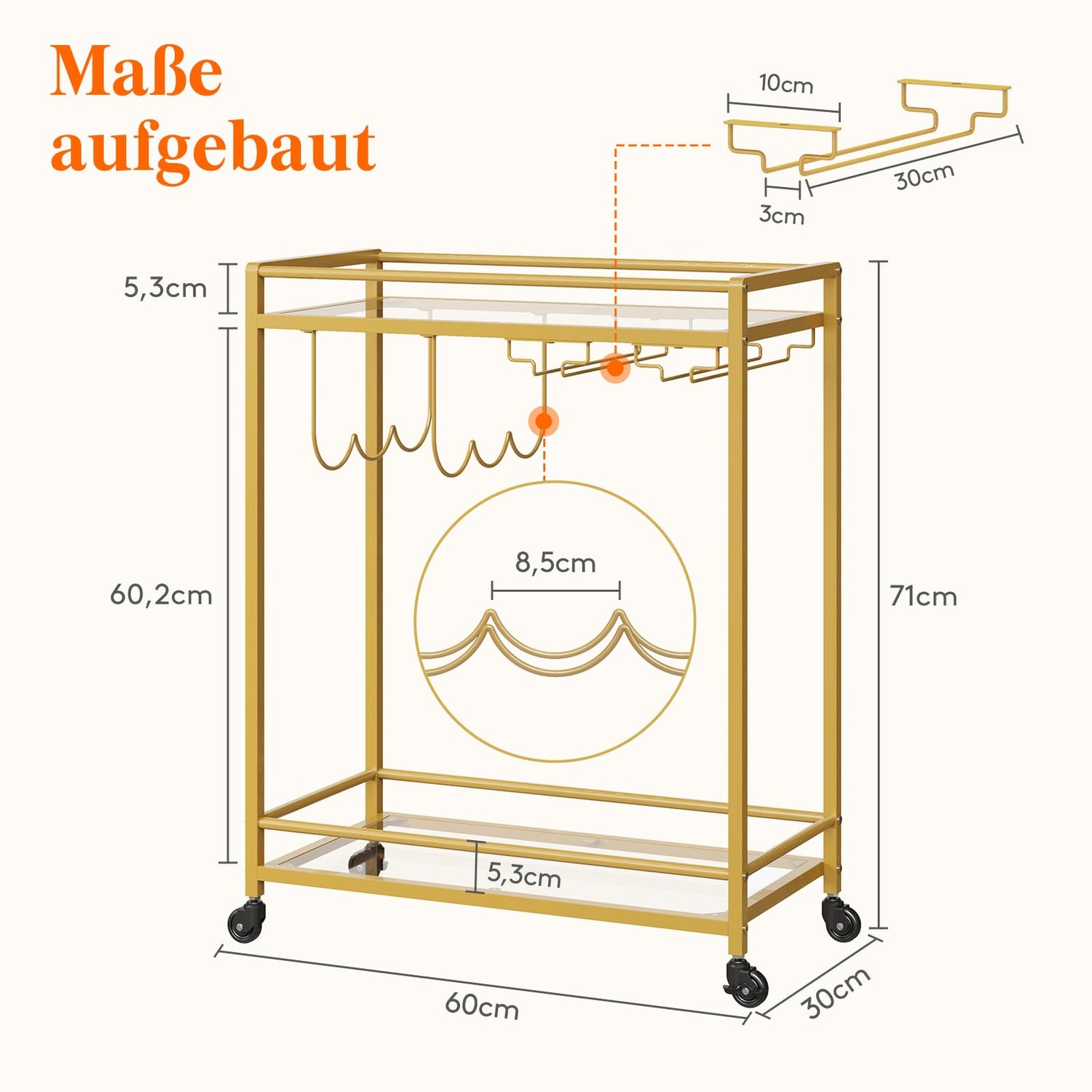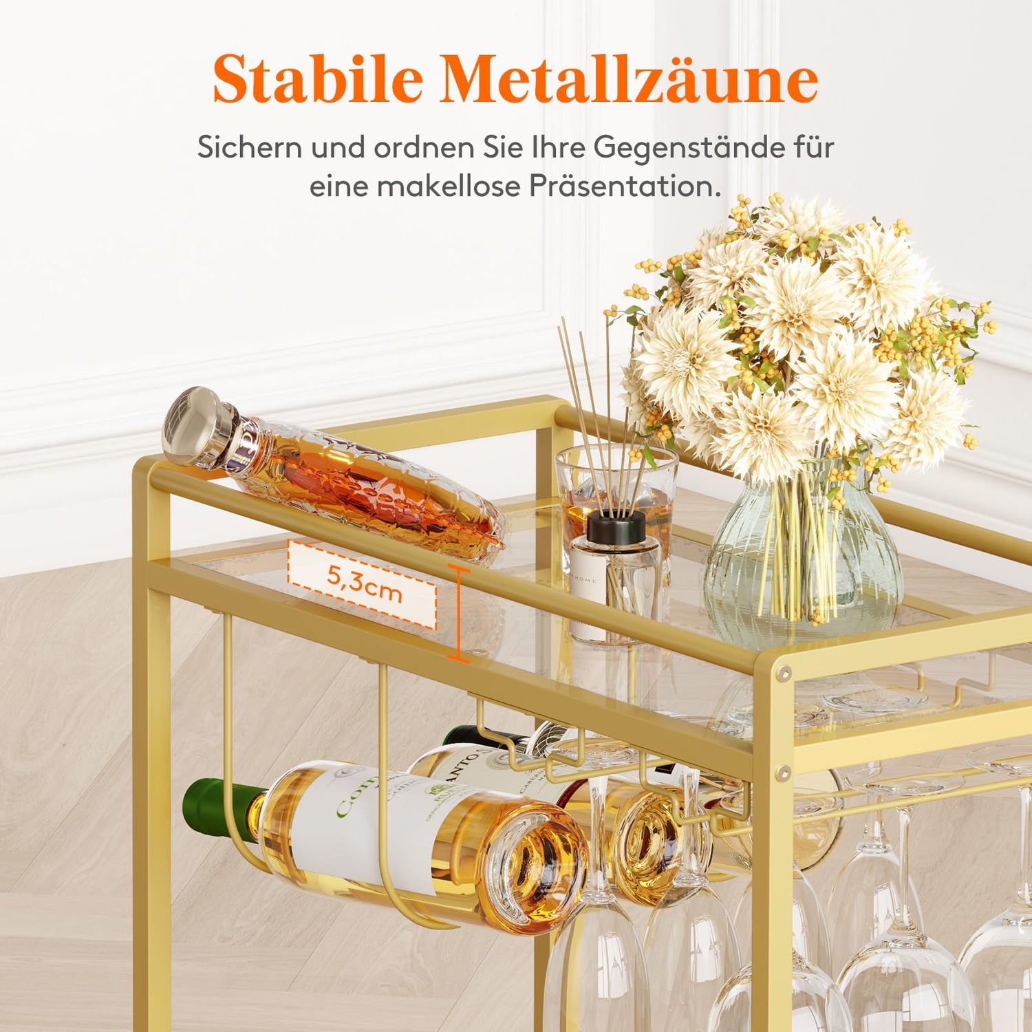 Lifewit Barwagen, Servierwagen mit 2 Etagen Glasböden, rollender Alkoholwagen mit feststellbaren Rädern, Glashalter und Weinregal, Getränkewagen für Küche, Esszimmer und Wohnzimmer, Gold