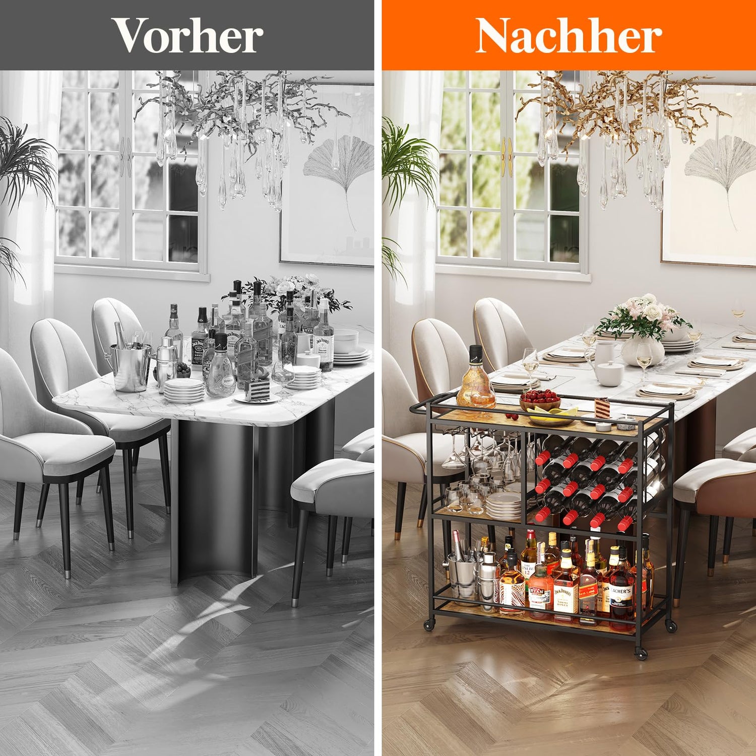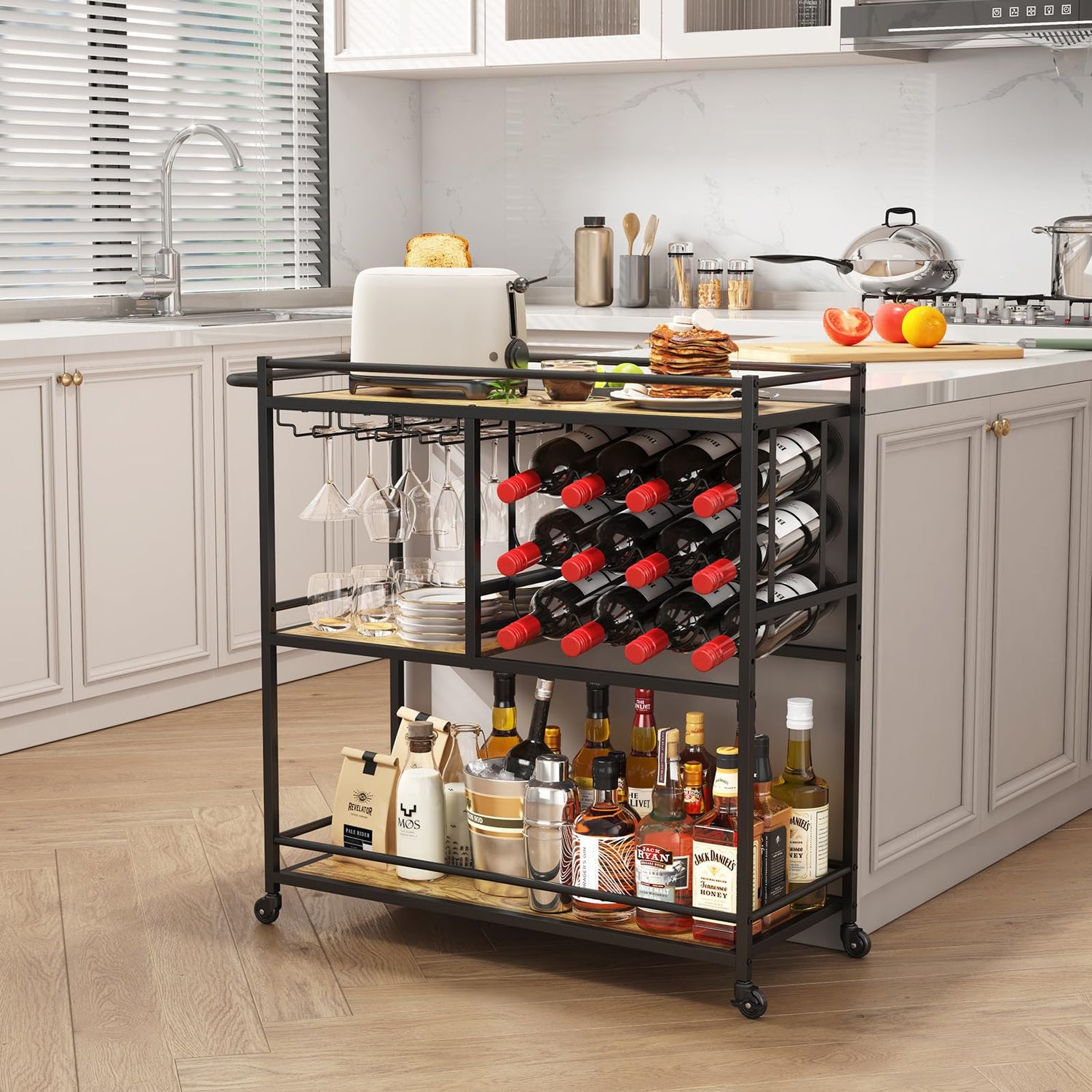 • Viel Stauraum: Der Servierwagen misst 31,6" x 13,1" x 33,9" (80,2 x 33,2 x 86 cm). Mit 3 Fächern, 12 Flaschenhaltern und 3 Reihen von Glashaltern ist dieser Küchenwagen perfekt geeignet, um Wein, Gläser, Spirituosen, Mixer, Getränke, Eiskübel und alle anderen Utensilien für Ihre Happy Hour zu präsentieren.
