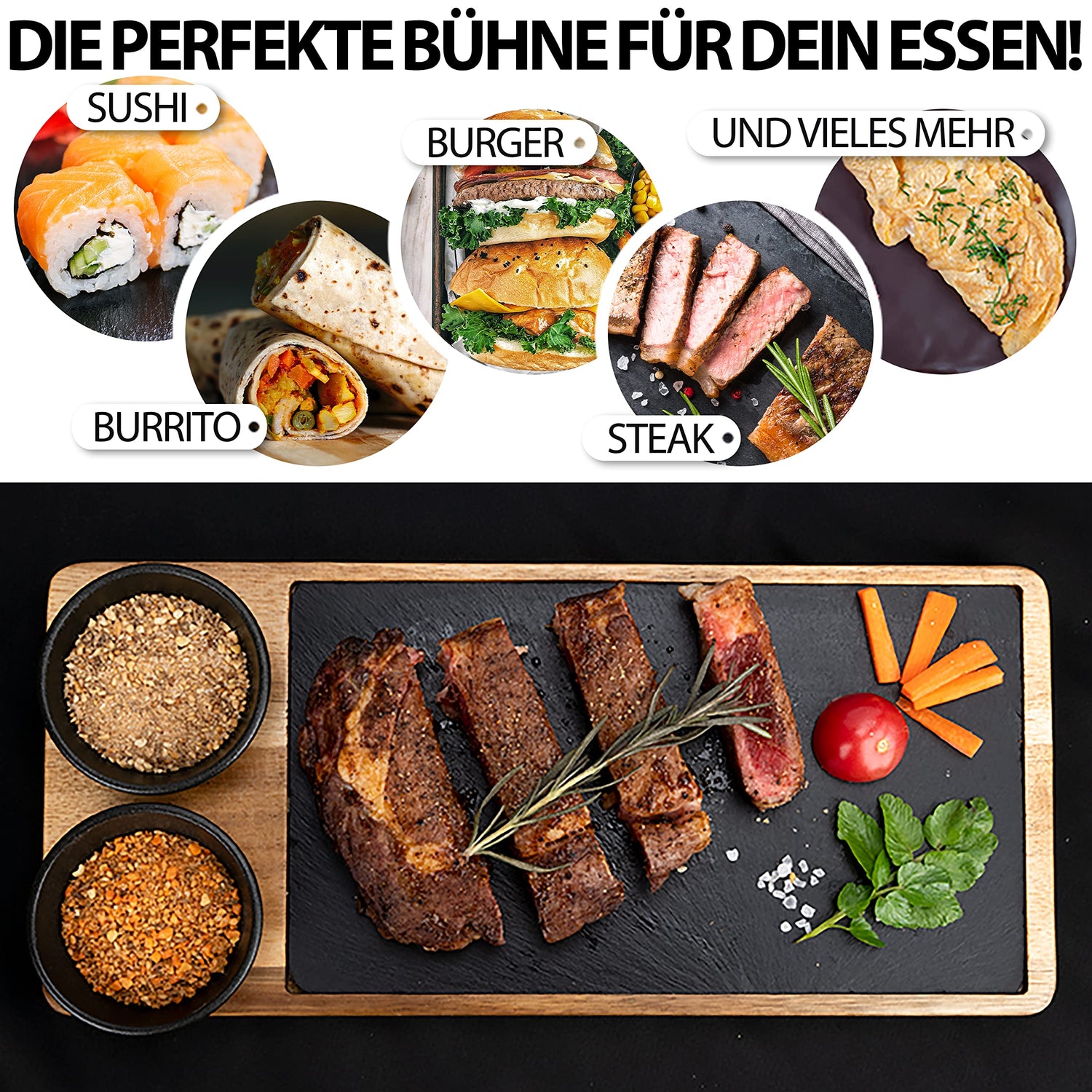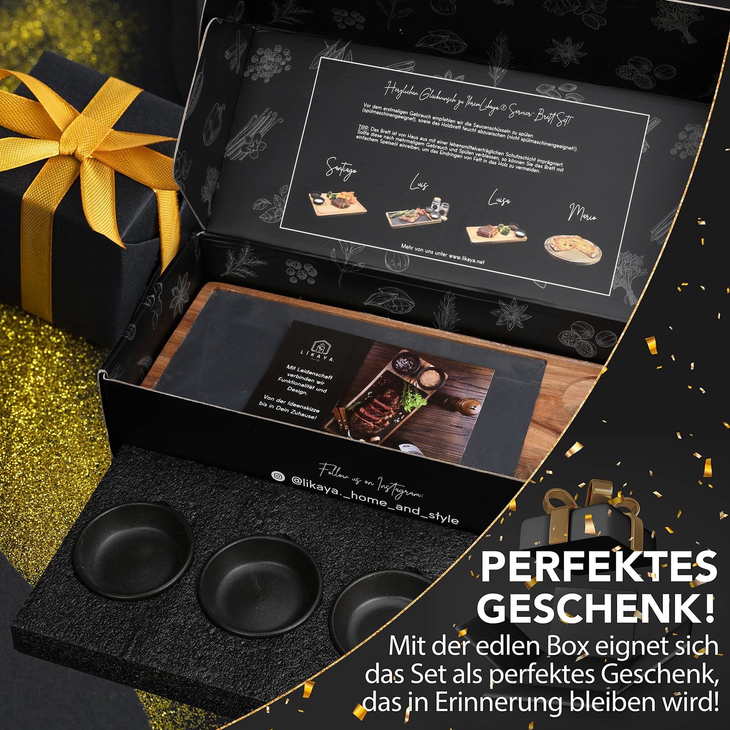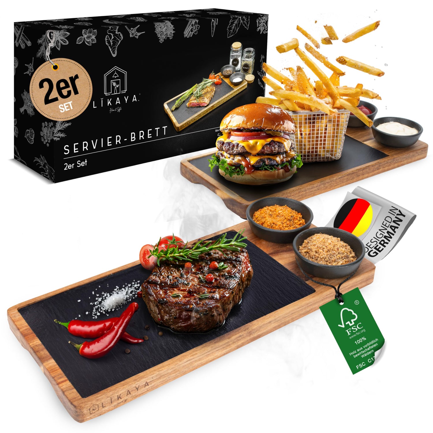 LIKAYA® Servierbrett 2er-Set 'LUIS' – FSC® Akazienholz & Schieferplatte mit Saucenschüsseln | Perfekt als Grillbrett, Steakbrett & Geschenk für Burger, Steak & Sushi