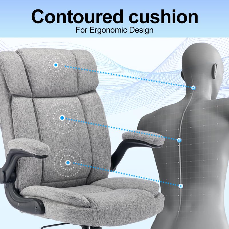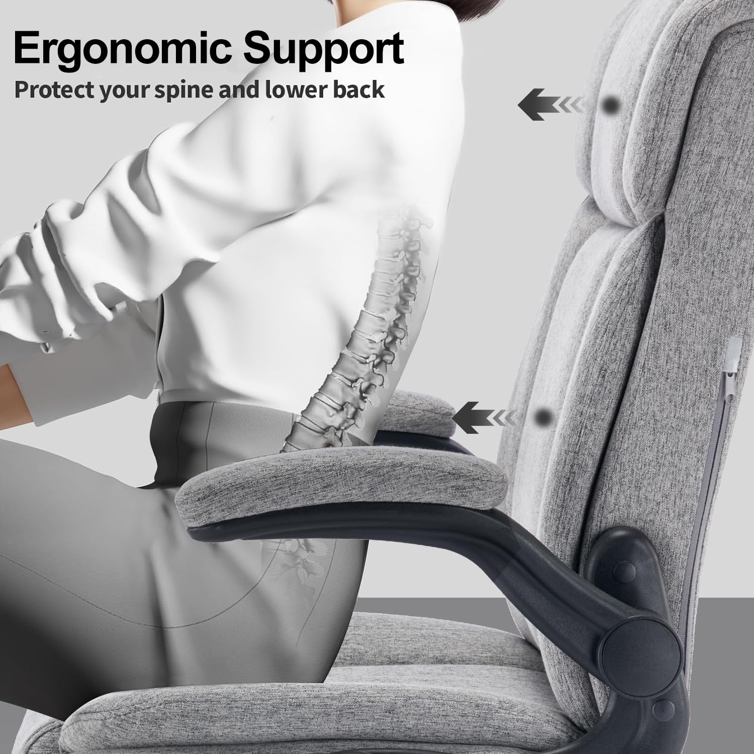 LIYURUI Bürostuhl Ergonomischer 150KG Belastbarkeit Chefsessel Stoff Flip-up Armlehnen/110° Schaukeln Chefsessel mit Hoher Rückenlehne und Breitem Sitz Schreibtischstuhl, Grau