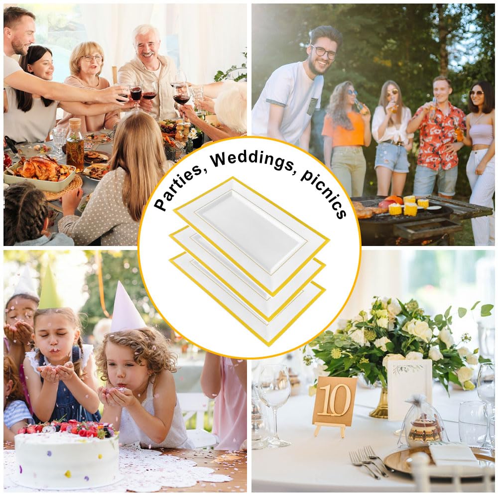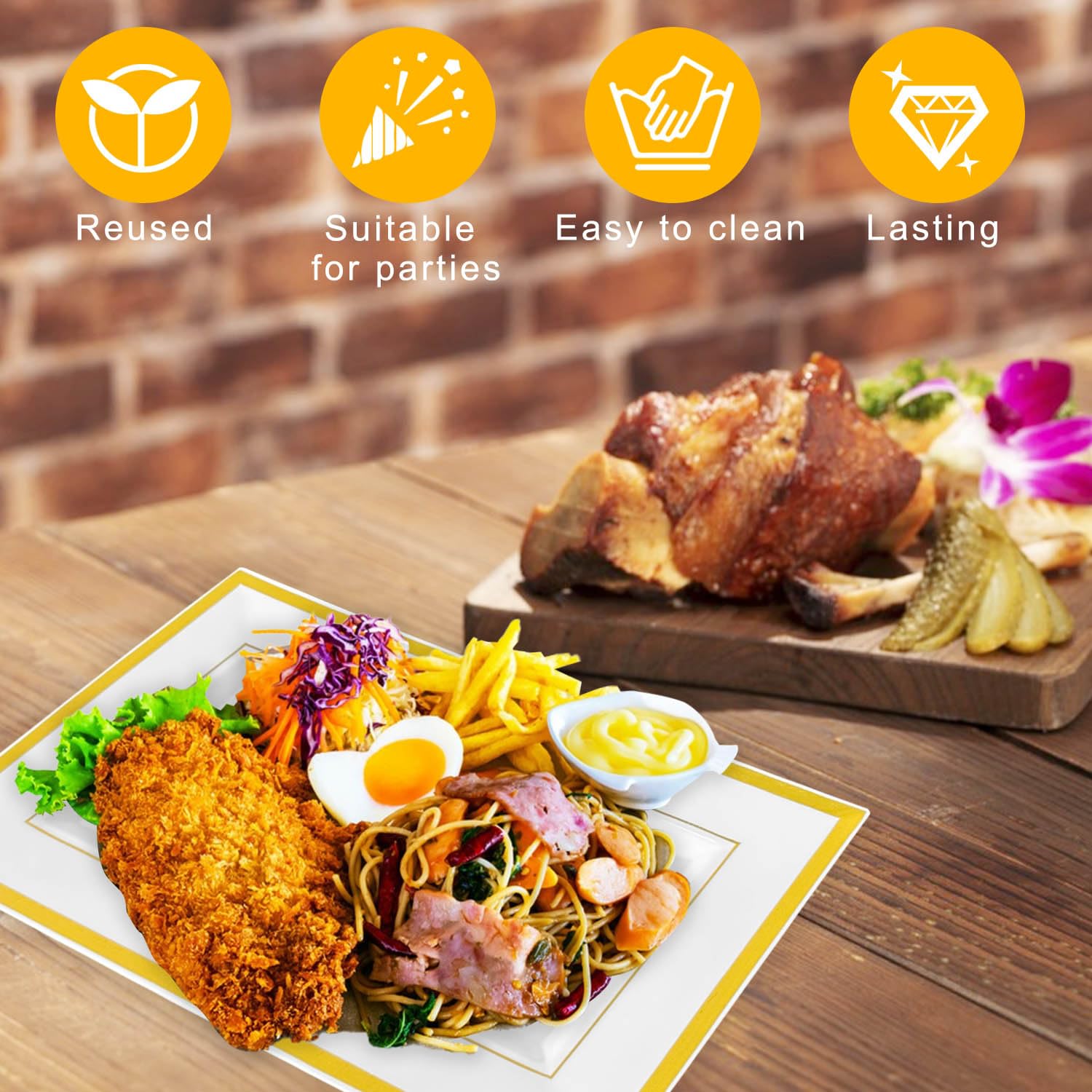 • 【Design】Anrichteplatte mit goldfarbenem Rand verleiht jedem Anlass eine Note von Raffinesse. Sind darauf ausgelegt, Hitze standzuhalten, wodurch sie sich perfekt für das Servieren von heißen oder kalten Speisen eignen, mit vollstem Vertrauen. Kann sich nicht biegen können gestapelt werden, einfach zu lagern, ohne Platz zu beanspruchen.