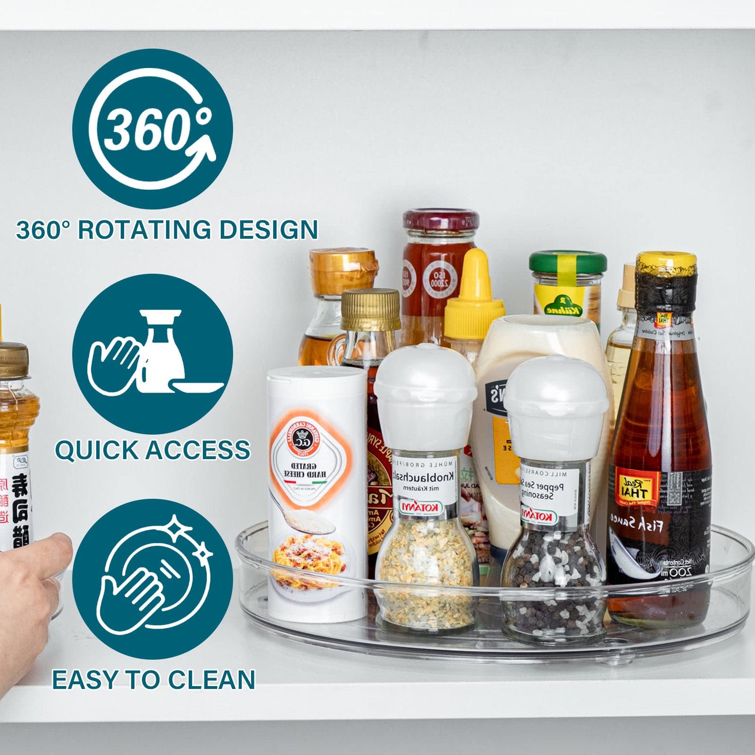 • 𝑻𝑹𝑨𝑵𝑺𝑷𝑨𝑹𝑬𝑵𝑻 & 𝑹𝑶𝑻𝑰𝑬𝑹𝑬𝑵𝑫: Die kühlschrank organizer drehbar besteht aus PET, einer Art dauerhafter und stabiler Kunststoff, kann schwerere ding unterstützen. Es kann 360° gedreht werden. Sie werden die Gewürze schnell finden