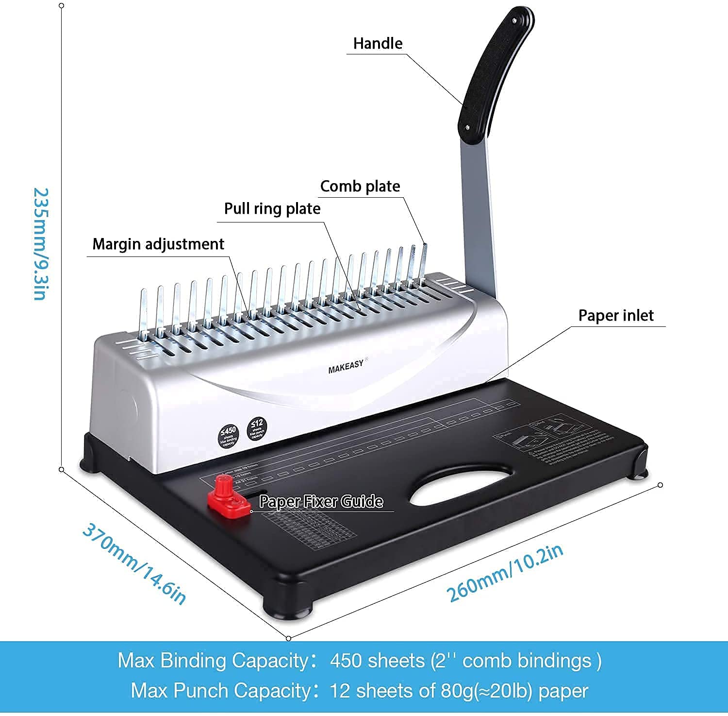 MAKEASY Bindegerät, Bindemaschine, 21 Löcher, bindet 450 Blatt, 12 Blatt Stanzkapazität, mit Starterkit 100 Stück PVC Bindung Stacheln, ideal für tägliche Office-Dokumente