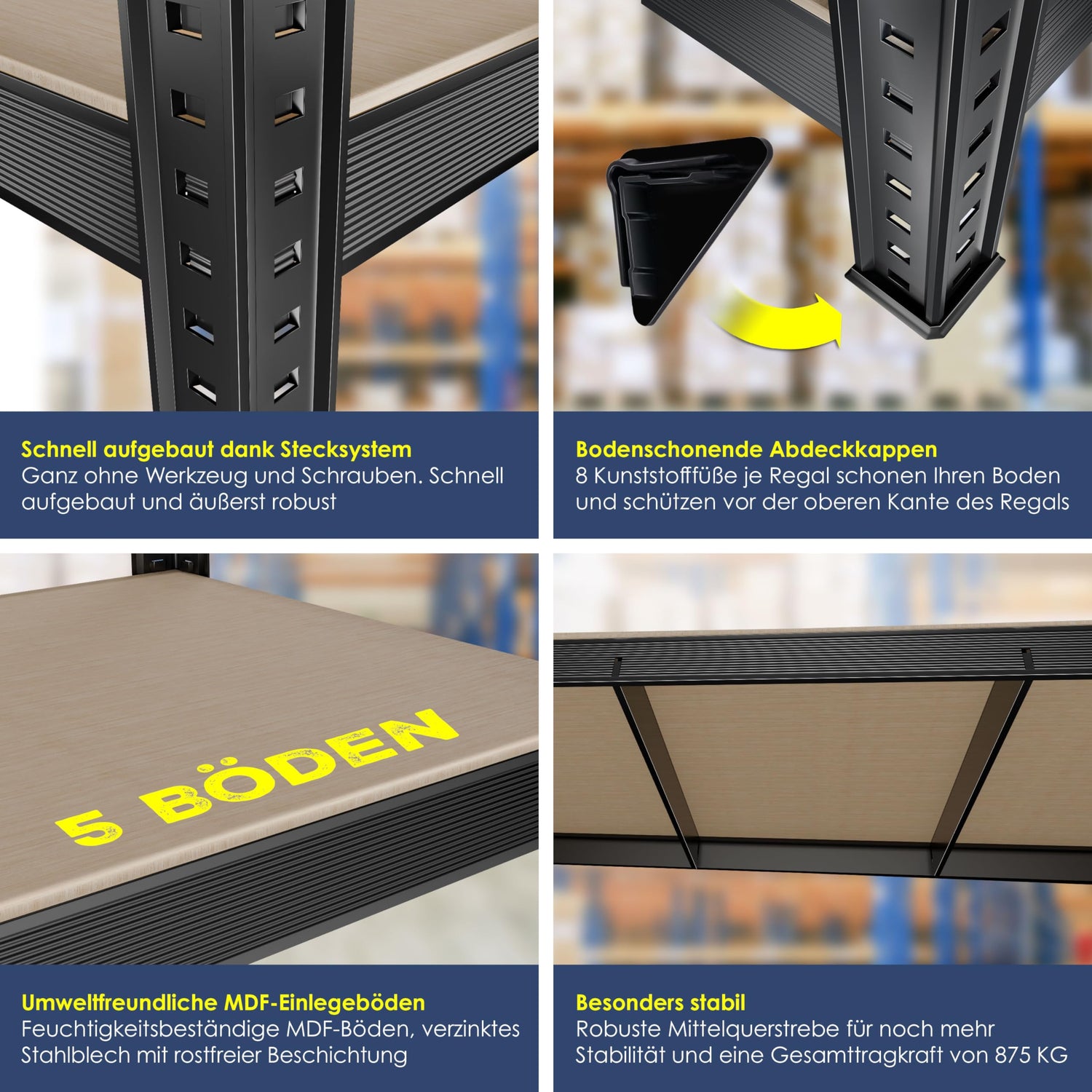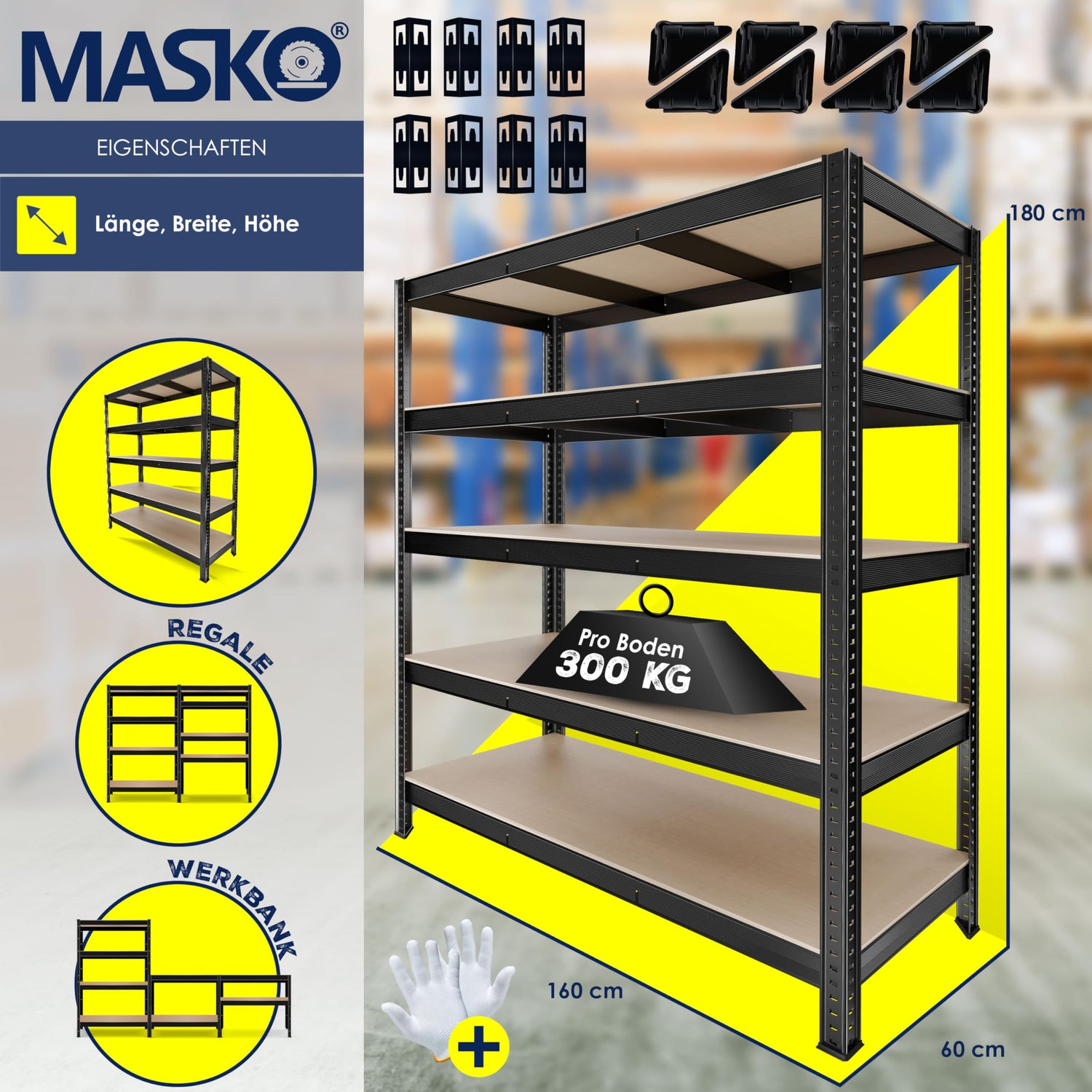 MASKO® Schwerlastregal Lagerregal Kellerregal 180x160x60cm, 1500kg belastbar, 5 verstellbare Ablagen, MDF-Platten Regal aus Metall, Steckregal, Werkstattregal Stahlgestell Garage Werkbank Schwarz
