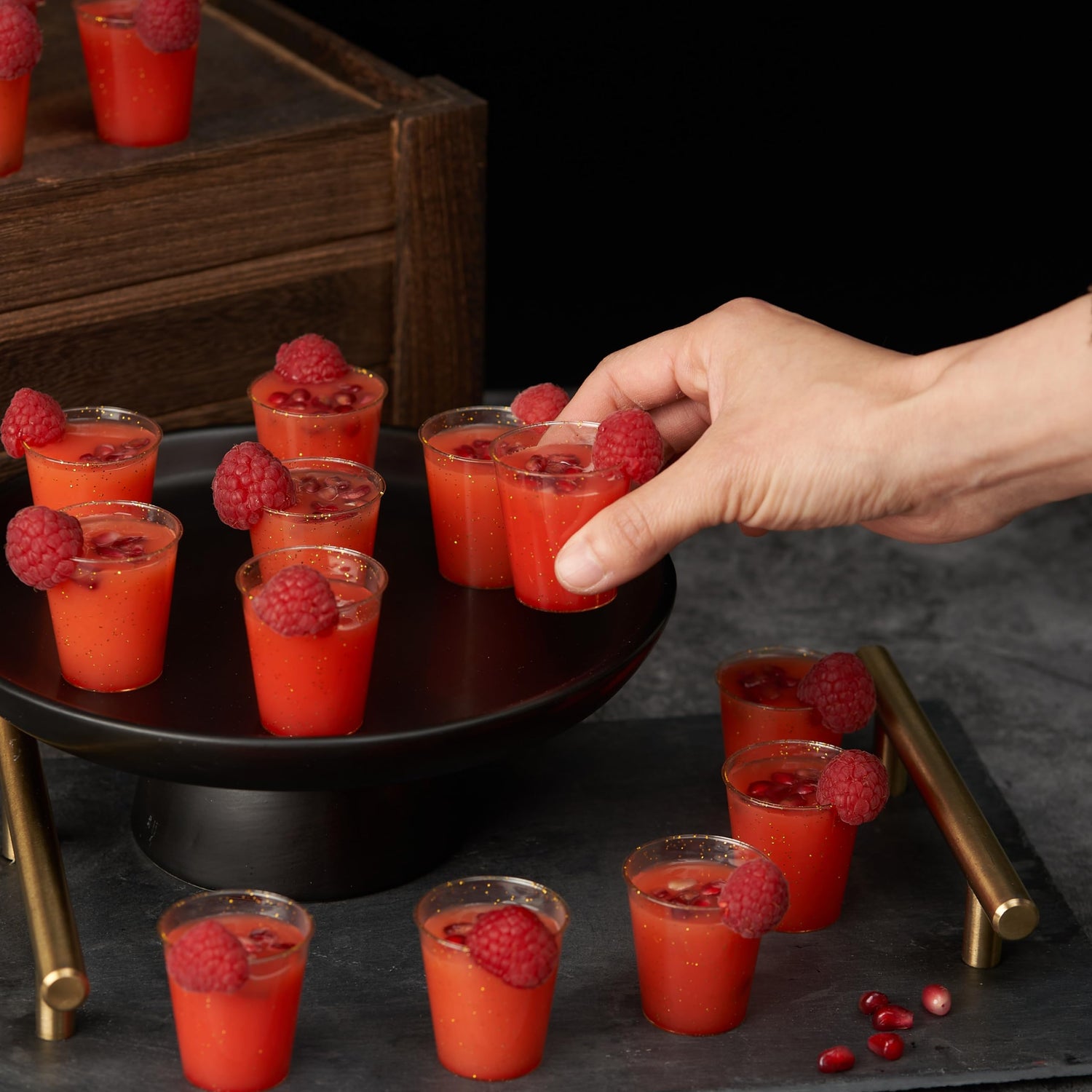 • ELEGANTES DESIGN: Diese 150 klaren Hartplastik Schnapsgläser mit goldenen Glitzerakzenten sind die Verkörperung von Eleganz. Ihr schlankes Design und die funkelnden Verzierungen machen sie zur perfekten Wahl, wenn Sie Ihrem Event einen Hauch von Raffinesse hinzufügen möchten.