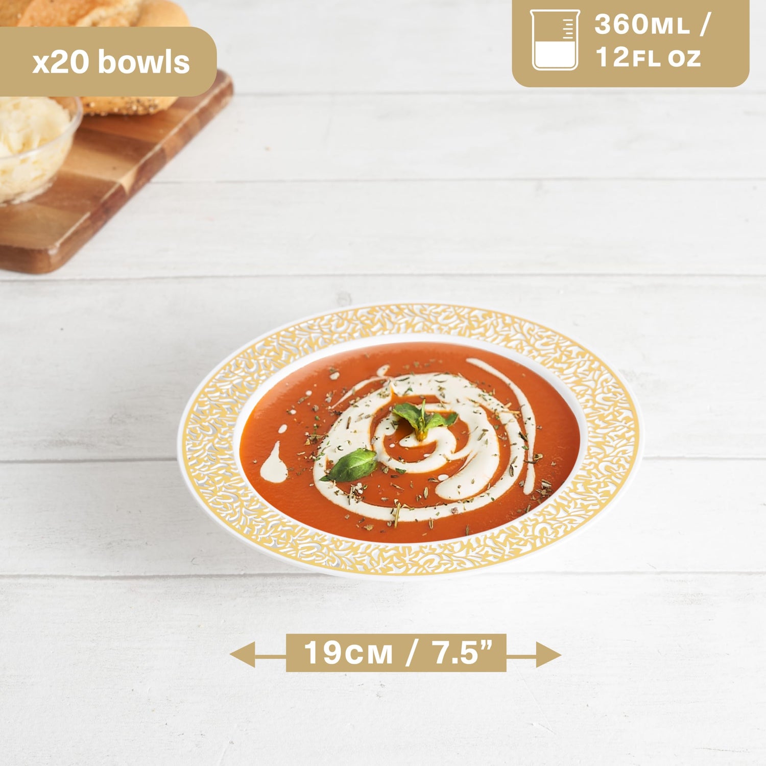 • Elegant und vielseitig: Verbessern Sie Ihr Esserlebnis mit unseren 20 hochwertigen weißen Plastikschalen mit stilvollem Goldrand. Perfekt zum Servieren von Vorspeisen, Suppen, Salaten, Desserts und mehr bei jeder Gelegenheit.