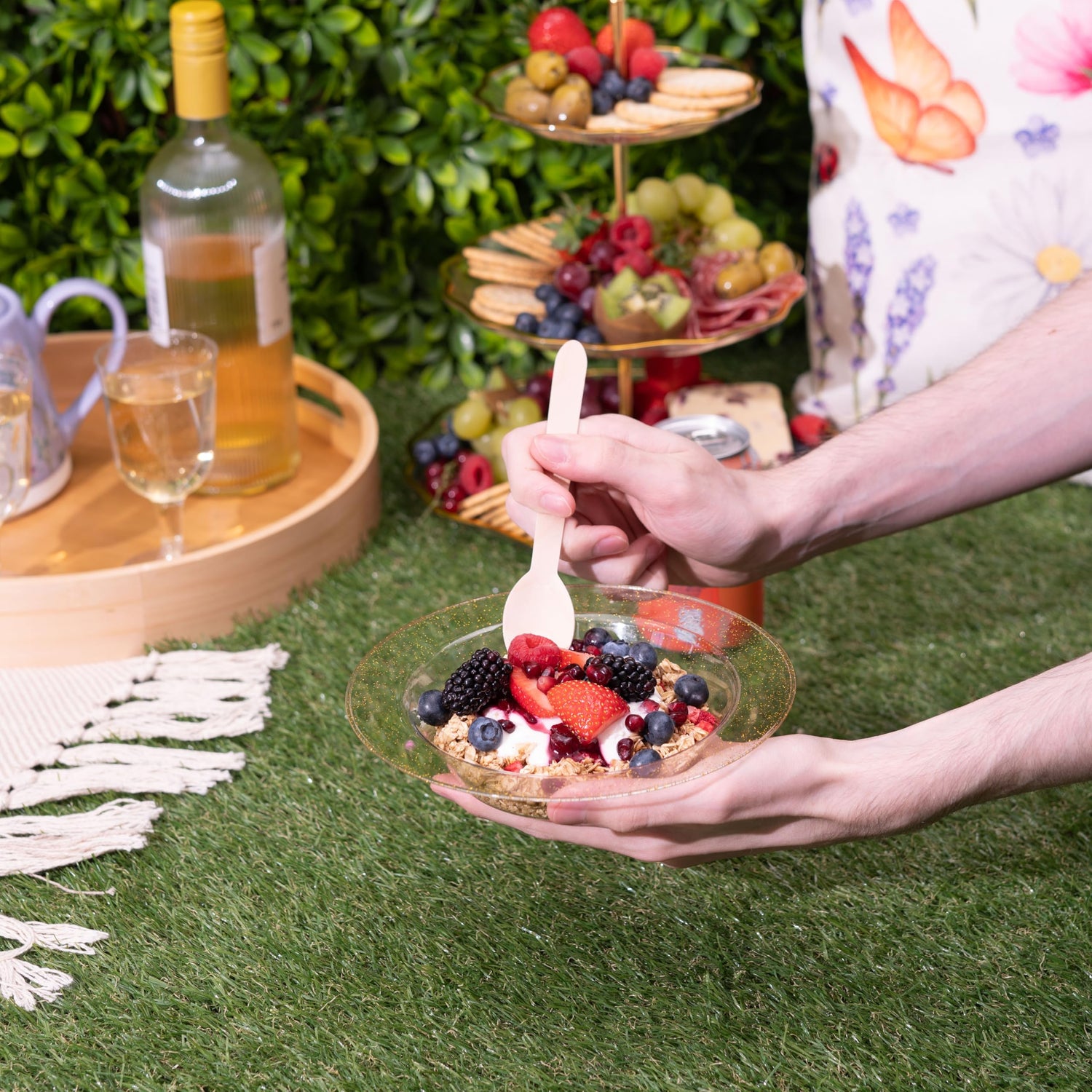 • Eleganter Gold-Glitzer: Verleihen Sie jedem Event einen Hauch von Raffinesse mit diesen klaren Hartplastikschalen, verziert mit funkelndem Gold-Glitzer, ideal zur Verschönerung Ihrer Tischdekoration.